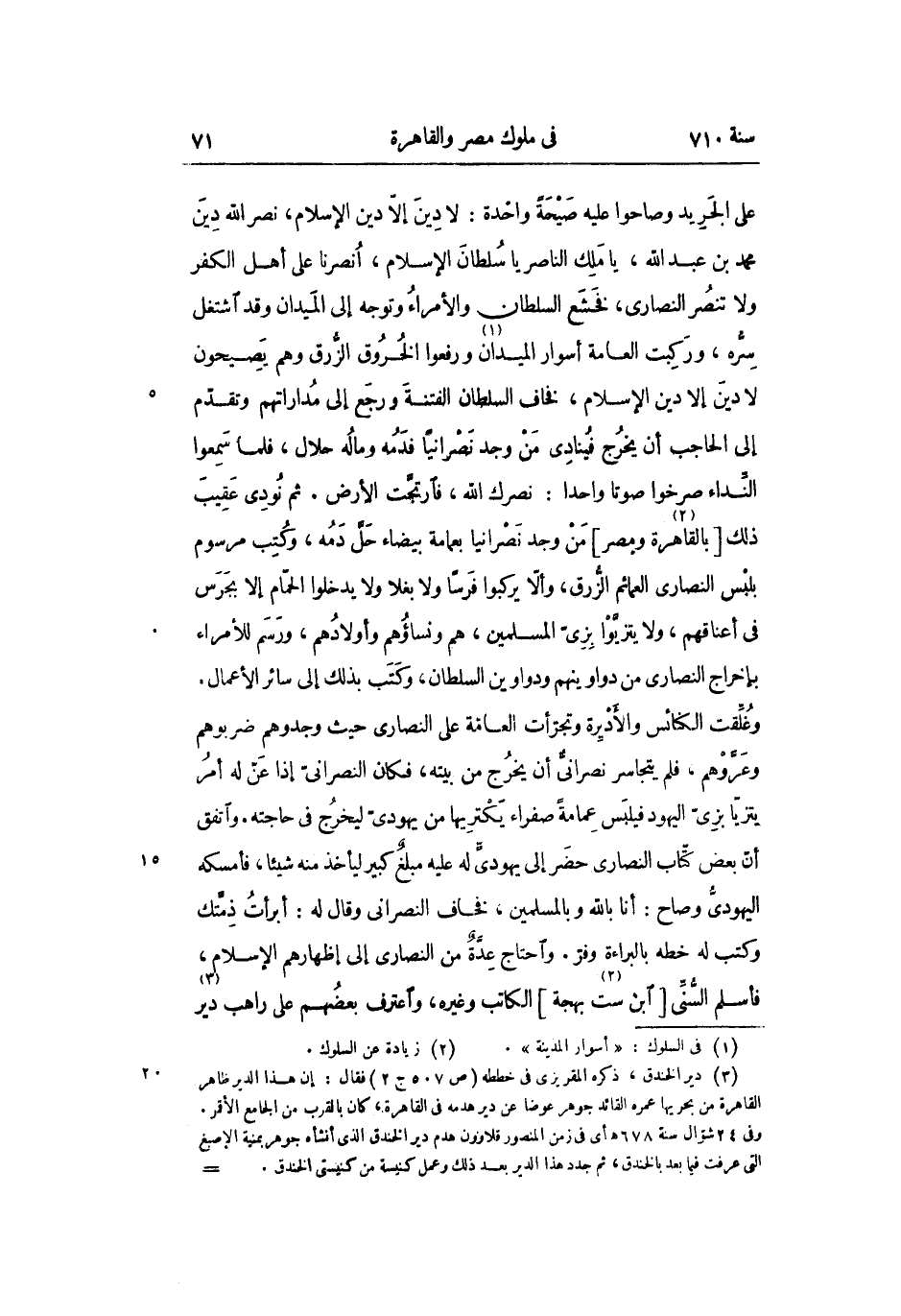 على الجريد وصاحوا عليه صيحة واحدة: لا دين إلّا دين الإسلام، نصر الله دين محمد بن عبد الله، يا ملك الناصر يا سلطان الإسلام، انصرنا على أهل الكفر ولا تنصر النصارى، فخشع السلطان والأمراء وتوجه إلى الميدان وقد اشتغل سرّه، وركبت العامة أسوار الميدان «1» ورفعوا الخروق الزّرق وهم يصيحون لا دين إلا دين الإسلام، فخاف السلطان الفتنة ورجع إلى مداراتهم وتقدّم إلى الحاجب أن يخرج فينادى من وجد نصرانيا فدمه وماله حلال، فلما سمعوا النّداء صرخوا صوتا واحدا: نصرك الله، فارتجّت الأرض. ثم نودى عقيب ذلك [بالقاهرة «2» ومصر] من وجد نصرانيا بعمامة بيضاء حلّ دمه، وكتب مرسوم بلبس النصارى العمائم الزّرق، وألّا يركبوا فرسا ولا بغلا ولا يدخلوا الحمّام إلا بجرس فى أعناقهم، ولا يتزيّوا بزىّ المسلمين، هم ونساؤهم وأولادهم، ورسم للأمراء بإخراج النصارى من دواوينهم ودواوين السلطان، وكتب بذلك إلى سائر الأعمال.