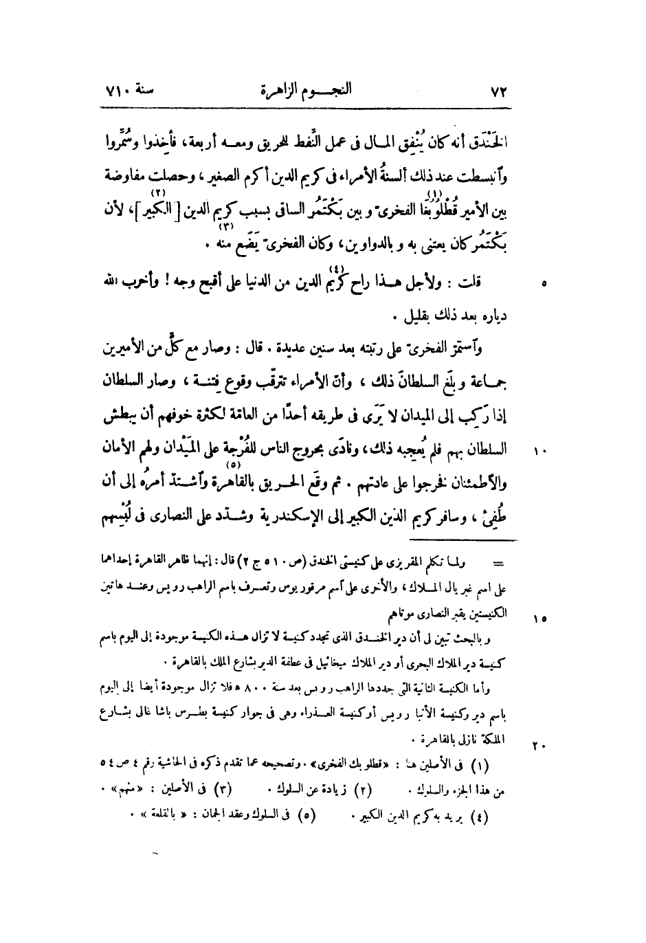 الخندق أنه كان ينفق المال فى عمل النّفط للحريق ومعه أربعة، فأخذوا وسمّروا وانبسطت عند ذلك ألسنة الأمراء فى كريم الدين أكرم الصغير، وحصلت مفاوضة بين الأمير قطلوبغا «1» الفخرىّ وبين بكتمر الساقى بسبب كريم الدين [الكبير «2» ] ، لأن بكتمر كان يعتنى به وبالدواوين، وكان الفخرىّ يضع منه «3» .