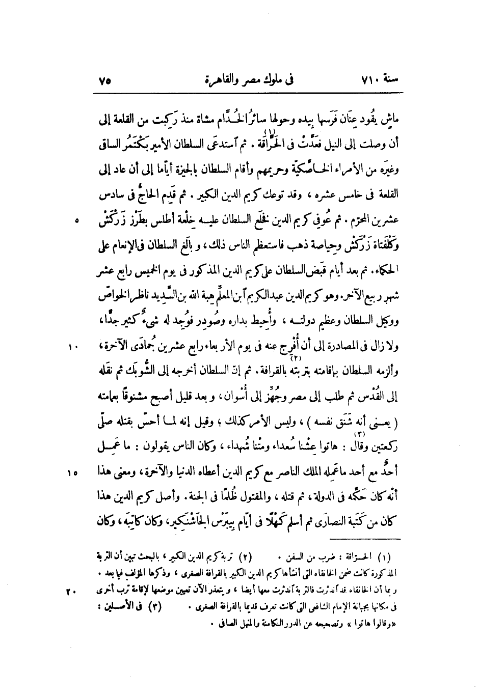 ماش يقود عنان فرسها بيده وحولها سائر الخدّام مشاة منذ ركبت من القلعة إلى أن وصلت إلى النيل فعدّت فى الحرّاقة «1» . ثم استدعى السلطان الأمير بكتمر الساقى وغيره من الأمراء الخاصّكيّة وحريمهم وأقام السلطان بالجيزة أيّاما إلى أن عاد إلى القلعة فى خامس عشره، وقد توعك كريم الدين الكبير. ثم قدم الحاجّ فى سادس عشرين المحرّم. ثم عوفى كريم الدين فخلع السلطان عليه خلعة أطلس بطرز زركش وكلفتاة زركش وحياصة ذهب فاستعظم الناس ذلك، وبالغ السلطان فى الإنعام على الحكماء. ثم بعد أيام قبض السلطان على كريم الدين المذكور فى يوم الخميس رابع عشر شهر ربيع الآخر. وهو كريم الدين عبد الكريم ابن المعلّم هبة الله بن السّديد ناظر الخواصّ ووكيل السلطان وعظيم دولته، وأحيط بداره وصودر فوجد له شىء كثير جدّا، ولا زال فى المصادرة إلى أن أفرج عنه فى يوم الأربعاء رابع عشرين جمادى الآخرة، وألزمه السلطان بإقامته بتربته «2» بالقرافة. ثم إنّ السلطان أخرجه إلى الشّوبك ثم نقله إلى القدس ثم طلب إلى مصر وجهّز إلى أسوان، وبعد قليل أصبح مشنوقا بعمامته (يعنى أنه شنق نفسه) ، وليس الأمر كذلك؛ وقيل إنه لما أحسّ بقتله صلّى ركعتين وقال «3» : هاتوا عشنا سعداء ومتنا شهداء، وكان الناس يقولون: ما عمل أحد مع أحد ما عمله الملك الناصر مع كريم الدين أعطاه الدنيا والآخرة، ومعنى هذا أنّه كان حكّمه فى الدولة، ثم قتله، والمقتول ظلما فى الجنة. وأصل كريم الدين هذا كان من كتبة النصارى ثم أسلم كهلا فى أيّام بيبرس الجاشنكير، وكان كاتبه، وكان