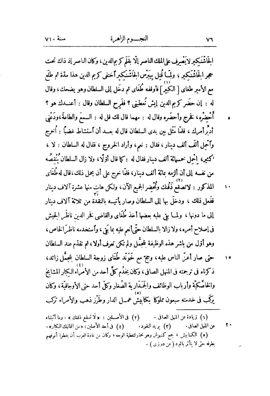 الجاشنكير لا يصرف على الملك الناصر إلّا بقلم كريم الدين، وكان الناصر إذ ذاك تحت حجر الجاشنكير؛ ولمّا قتل بيبرس الجاشنكير اختفى كريم الدين هذا مدّة ثم طلع مع الأمير طغاى [الكبير «1» ] فأوقفه طغاى ثم دخل إلى السلطان وهو يضحك، وقال له: إن حضر كريم الدين إيش تعطينى؟ ففرح السلطان وقال: أعندك هو؟
