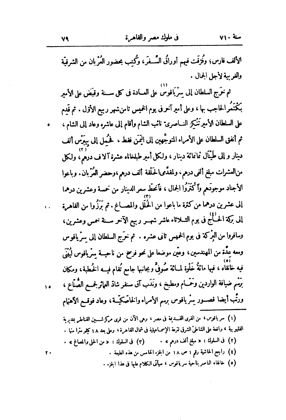 ثم خرج السلطان إلى سرياقوس «1» على العادة فى كل سنة وقبض على الأمير بكتمر الحاجب بها، وعلى أمير آخر فى يوم الخميس ثامن شهر ربيع الأوّل. ثم قدم على السلطان الأمير تنكز الناصرىّ نائب الشام وأقام إلى عاشره وعاد إلى الشام، ثم أنفق السلطان على الأمراء المتوجّهين إلى اليمن فقط، فحمل إلى بيبرس ألف دينار وإلى طينال ثمانمائة دينار، ولكل أمير طبلخاناه عشرة آلاف درهم «2» ، ولكل من العشرات مبلغ ألفى درهم، ولمقدّمى الحلقة ألف درهم، وحضر العربان. وباعوا الأجناد موجودهم واكتروا الجمال، فانحطّ سعر الدينار من خمسة وعشرين درهما إلى عشرين درهما من كثرة ما باعوا من الحلل «3» والمصاغ. ثم برزوا من القاهرة إلى بركة الحاج «4» فى يوم الثلاثاء عاشر شهر ربيع الآخر سنة خمس وعشرين، وسافروا من البركة فى يوم الخميس ثانى عشره. ثم خرج السلطان إلى سرياقوس ومعه عدّة من المهندسين، وعيّن موضعا على نحو فرسخ من ناحية سرياقوس ليبنى فيه خانقاه «5» ، فيها مائة خلوة لمائة صوفىّ وبجانبها جامع تقام فيه الخطبة، ومكان برسم ضيافة الواردين وحمّام ومطبخ، وندب آق سنقر شادّ العمائر لجمع الصّنّاع، ورتّب أيضا قصور سرياقوس برسم الأمراء والخاصّكيّة، وعاد فوقع الاهتمام