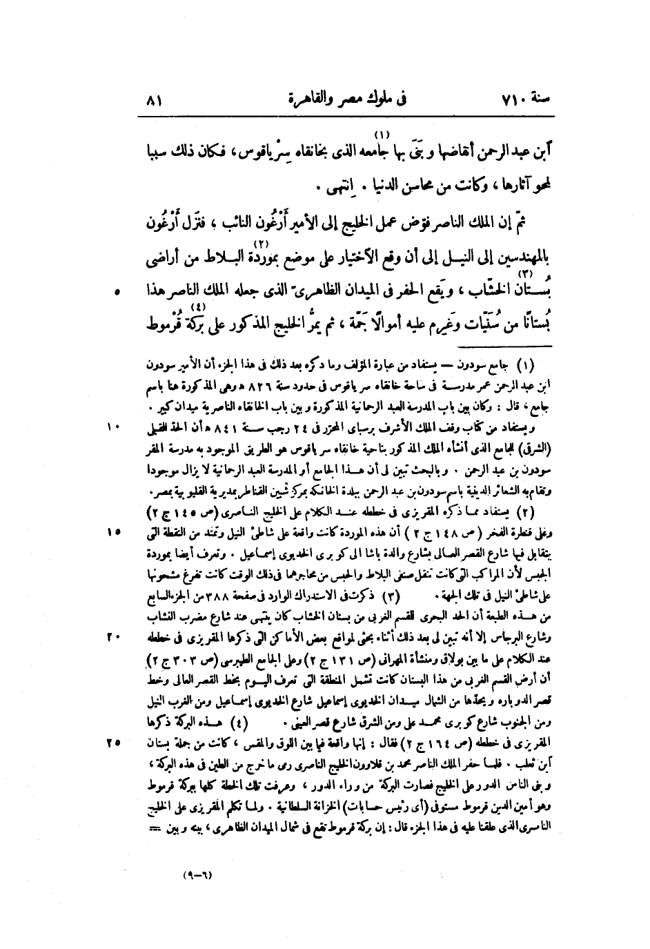 ثمّ إن الملك الناصر فوّض عمل الخليج إلى الأمير أرغون النائب، فنزل أرغون بالمهندسين إلى النيل إلى أن وقع الاختيار على موضع بموردة «2» البلاط من أراضى بستان «3» الخشّاب، ويقع الحفر فى الميدان الظاهرىّ الذي جعله الملك الناصر هذا بستانا من سنيّات وغرم عليه أموالا جمّة، ثم يمرّ الخليج المذكور على بركة «4» قرموط