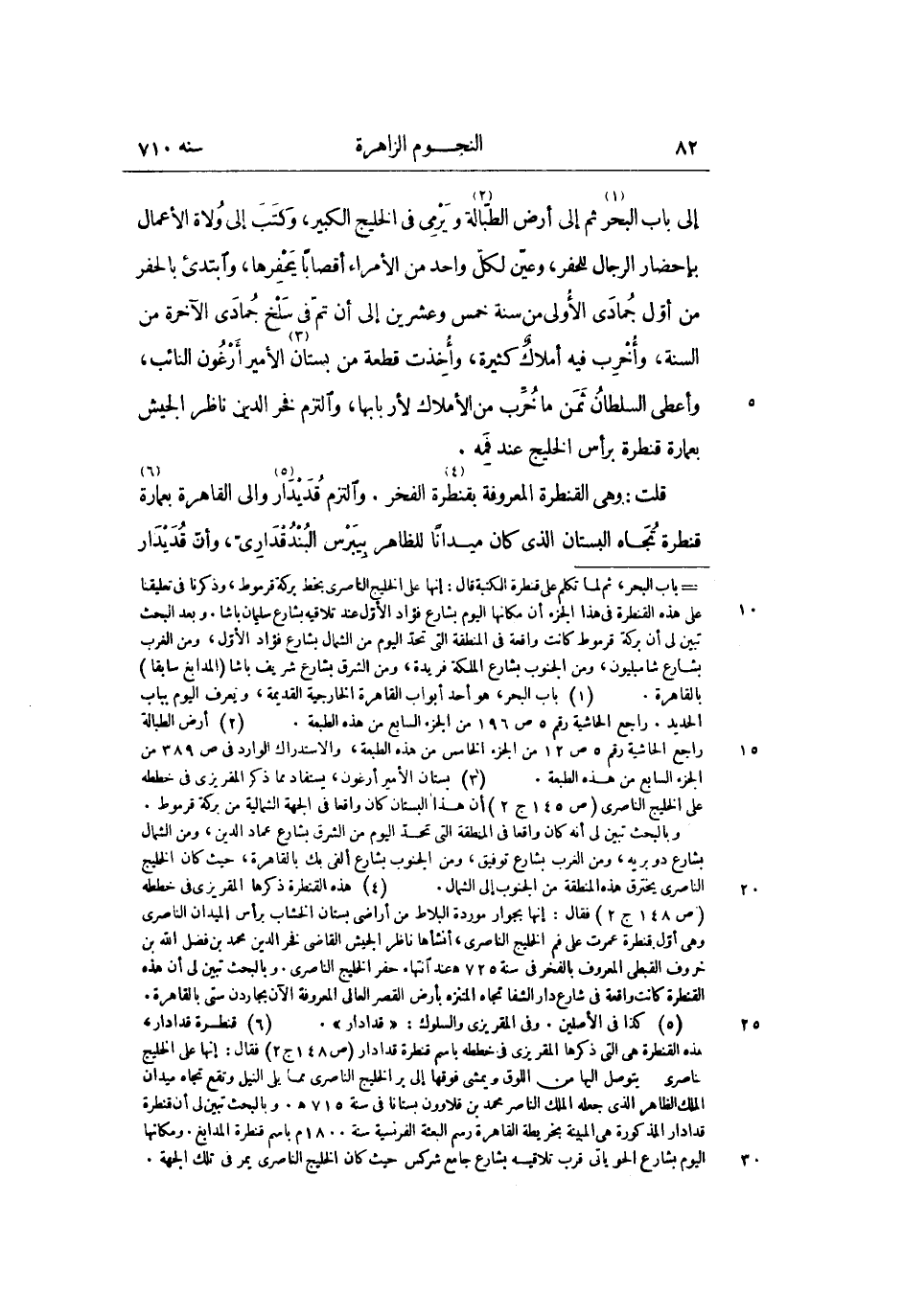 قلت: وهى القنطرة المعروفة بقنطرة «4» الفخر. والتزم قديدار «5» والى القاهرة بعمارة «6» قنطرة تجاه البستان الذي كان ميدانا للظاهر بيبرس البندقدارىّ، وأنّ قديدار
