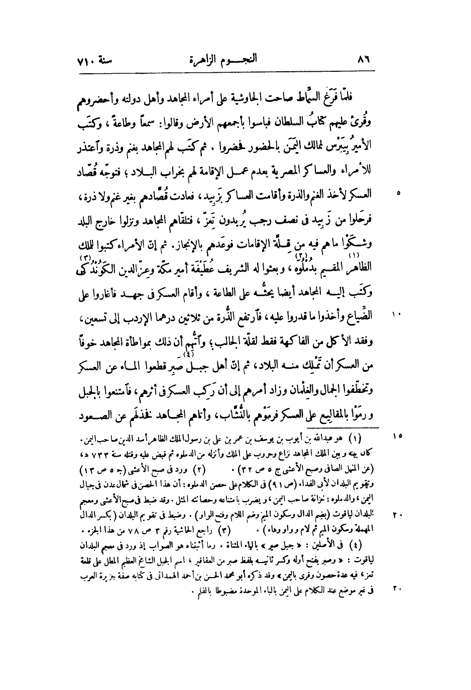 فلمّا فرغ السّماط صاحت الجاوشية على أمراء المجاهد وأهل دولته وأحضروهم وقرئ عليهم كتاب السلطان فباسوا بأجمعهم الأرض وقالوا: سمعا وطاعة، وكتب الأمير بيبرس لممالك اليمن بالحضور فحضروا. ثم كتب لهم المجاهد بغنم وذرة واعتذر للأمراء والعساكر المصرية بعدم عمل الإقامة لهم بخراب البلاد؛ فتوجّه قصّاد العسكر لأخذ الغنم والذرة وأقامت العساكر بزبيد، فعادت قصّادهم بغير غنم ولا ذرة، فرحلوا من زبيد فى نصف رجب يريدون تعزّ، فتلقّاهم المجاهد ونزلوا خارج البلد وشكوا ما هم فيه من قلّة الإقامات فوعدهم بالإنجاز. ثم إنّ الأمراء كتبوا للملك الظاهر «1» المقيم بدملوه «2» ، وبعثوا له الشريف عطيفة أمير مكّة وعزّ الدين الكوندكى «3» وكتب إليه المجاهد أيضا يحثّه على الطاعة، وأقام العسكر فى جهد فأغاروا على الضّياع وأخذوا ما قدروا عليه، فارتفع الذّرة من ثلاثين درهما الإردب إلى تسعين، وفقد الأكل من الفاكهة فقط لقلّة الجالب؛ واتّهم أن ذلك بمواطأة المجاهد خوفا من العسكر أن تملك منه البلاد، ثم إنّ أهل جبل «4» صبر قطعوا الماء عن العسكر وتخطّفوا الجمال والغلمان وزاد أمرهم إلى أن ركب العسكر فى أثرهم، فامتنعوا بالجبل ورموا بالمقاليع على العسكر فرموهم بالنّشّاب، وأتاهم المجاهد فخذلهم عن الصعود