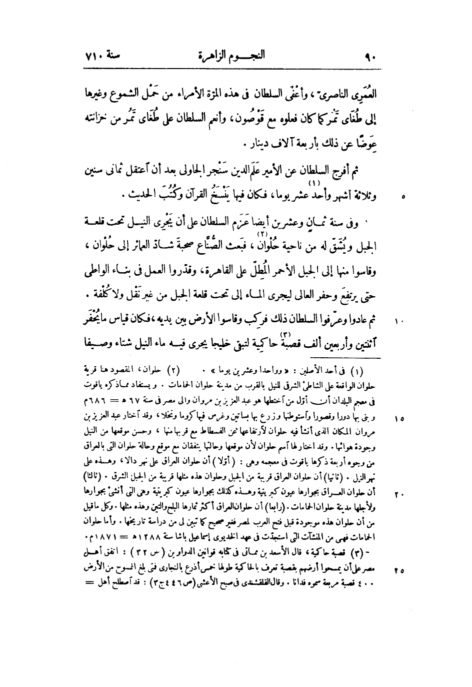 وفى سنة ثمان وعشرين أيضا عزم السلطان على أن يجرى النيل تحت قلعة الجبل ويشقّ له من ناحية حلوان «2» ، فبعث الصّنّاع صحبة شادّ العمائر إلى حلوان، وقاسوا منها إلى الجبل الأحمر المطلّ على القاهرة، وقدّروا العمل فى بناء الواطى حتى يرتفع وحفر العالى ليجرى الماء إلى تحت قلعة الجبل من غير نقل ولا كلفة.