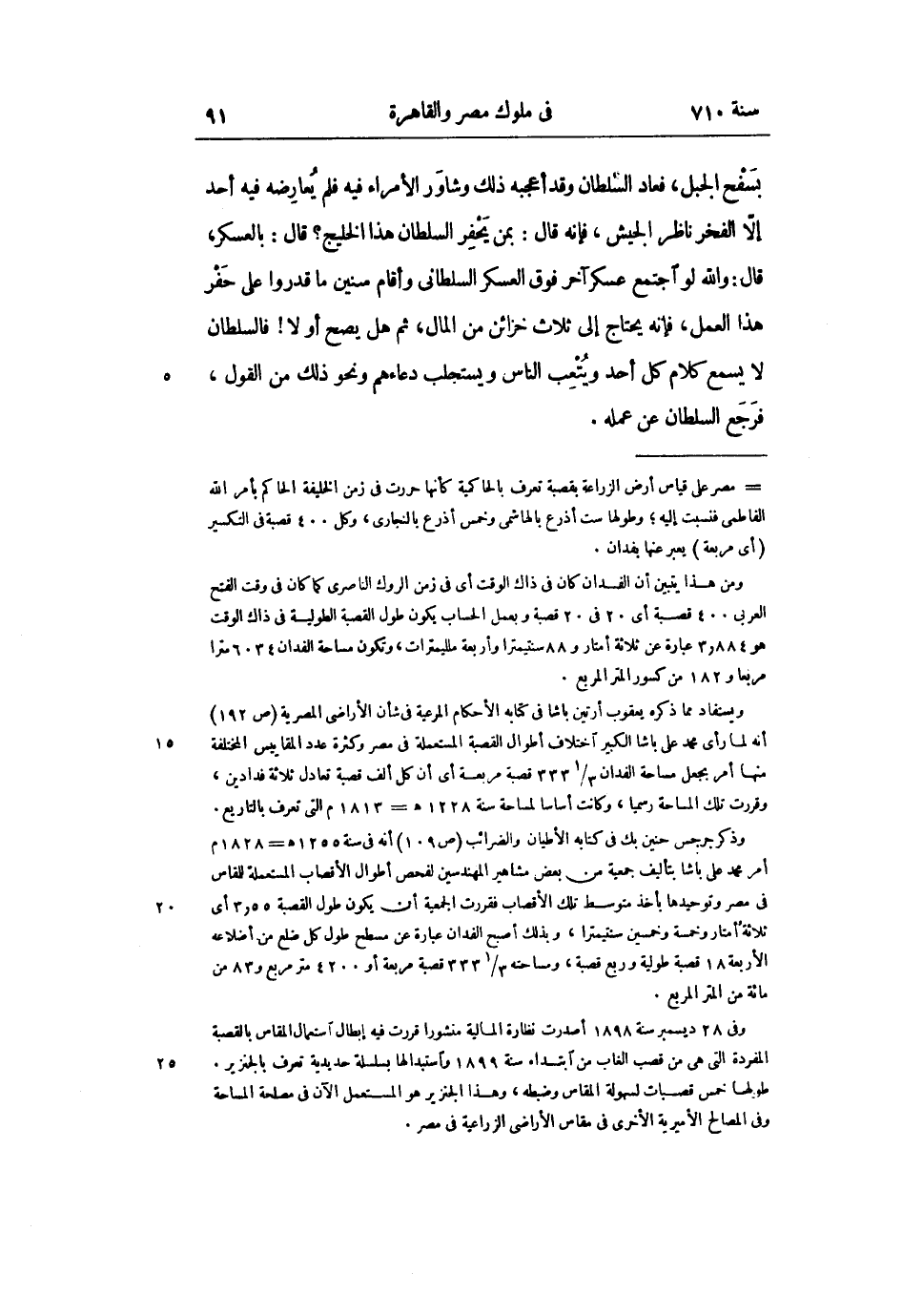 بسفح الجبل، فعاد السّلطان وقد أعجبه ذلك وشاور الأمراء فيه فلم يعارضه فيه أحد إلّا الفخر ناظر الجيش، فإنه قال: بمن يحفر السلطان هذا الخليج؟ قال: بالعسكر، قال: والله لو اجتمع عسكر آخر فوق العسكر السلطانى وأقام سنين ما قدروا على حفر هذا العمل، فإنه يحتاج إلى ثلاث خزائن من المال، ثم هل يصح أولا! فالسلطان لا يسمع كلام كل أحد ويتعب الناس ويستجلب دعاءهم ونحو ذلك من القول، فرجع السلطان عن عمله.