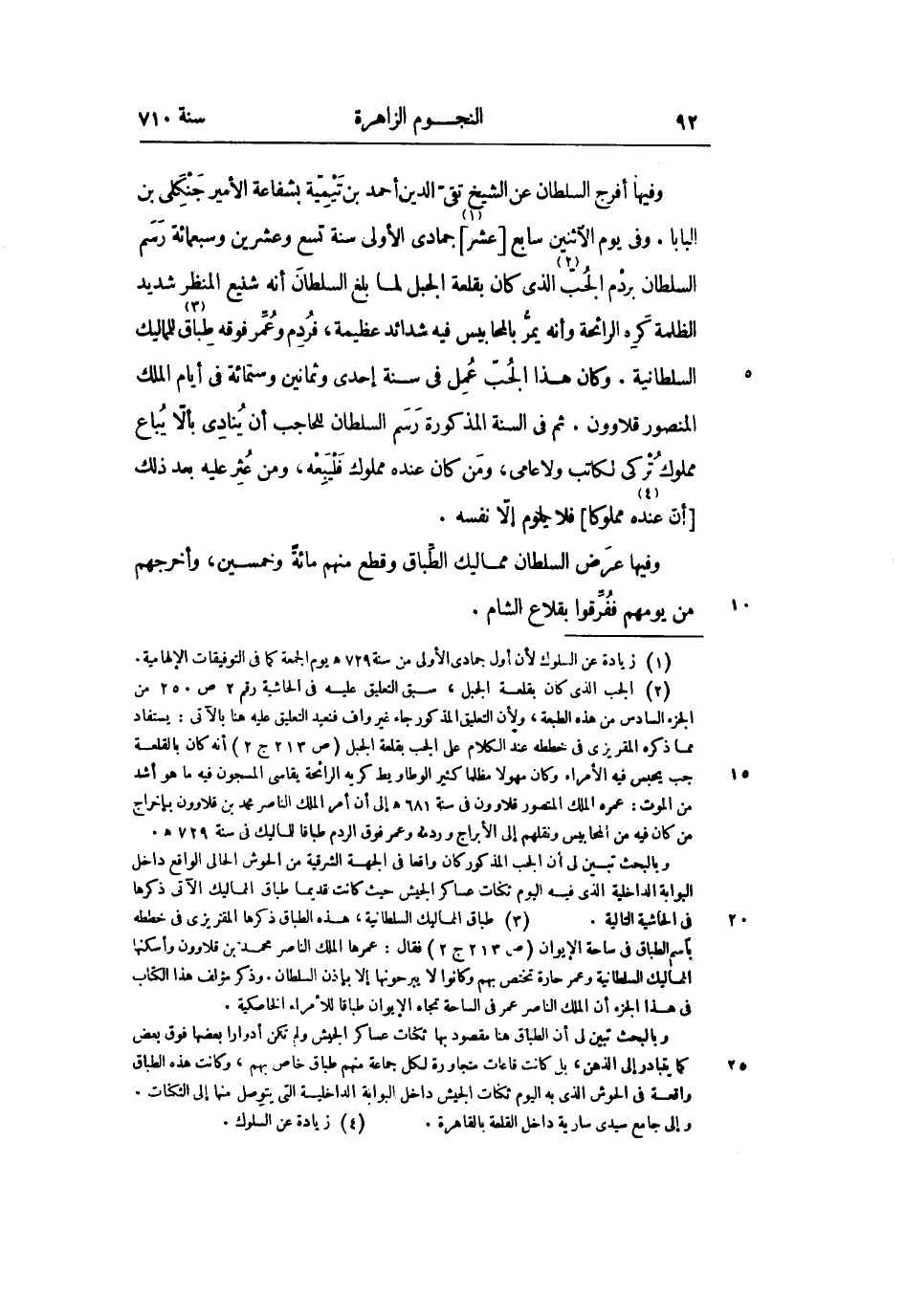 وفيها أفرج السلطان عن الشيخ تقىّ الدين أحمد بن تيميّة بشفاعة الأمير جنكلى بن البابا. وفى يوم الاثنين سابع [عشر «1» ] جمادى الأولى سنة تسع وعشرين وسبعمائة رسم السلطان بردم الجبّ «2» الذي كان بقلعة الجبل لما بلغ السلطان أنه شنيع المنظر شديد الظلمة كره الرائحة وأنه يمرّ بالمحابيس فيه شدائد عظيمة، فردم وعمّر فوقه طباق «3» للمماليك السلطانية. وكان هذا الجبّ عمل فى سنة إحدى وثمانين وستمائة فى أيام الملك المنصور قلاوون. ثم فى السنة المذكورة رسم السلطان للحاجب أن ينادى بألّا يباع مملوك تركى لكاتب ولا عامى، ومن كان عنده مملوك فليبعه، ومن عثر عليه بعد ذلك [أنّ عنده «4» مملوكا] فلا يلوم إلّا نفسه.