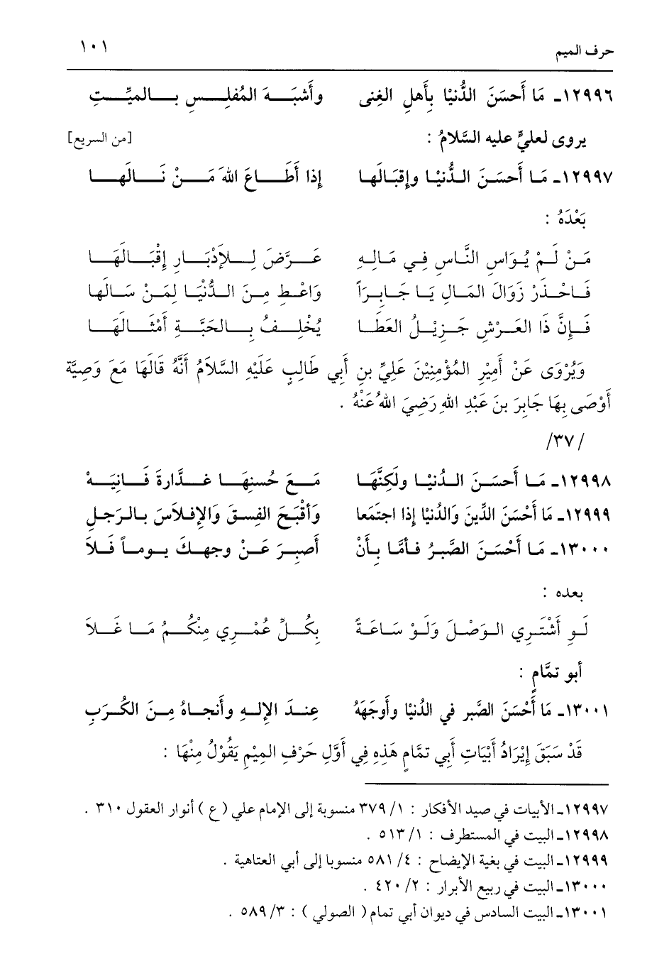 قَدْ سَبَقَ إِيْرَادُ أَبْيَاتِ أَبِي تمَّامٍ هَذِهِ فِي أَوَّلِ حَرْفِ المِيْمِ يَقُوْلُ مِنْهَا: