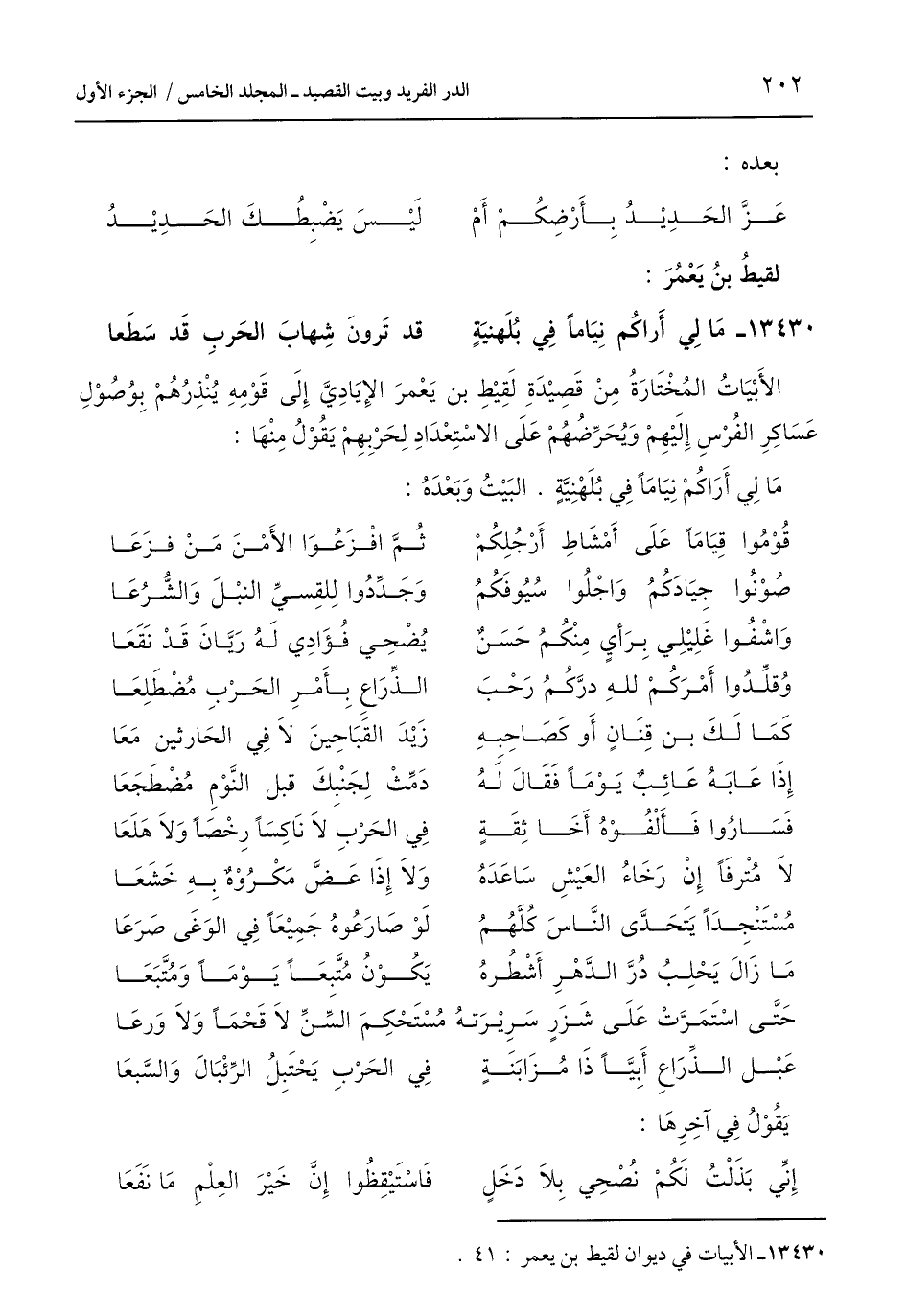 الأَبْيَاتُ المُخْتَارَةُ مِنْ قَصيْدَةِ لَقِيْطِ بن يَعْمرَ الإِيَادِيَّ إِلَى قَوْمِهِ يُنْذِرُهُمْ بِوُصوْلِ عَسَاكِرِ الفُرْسِ إِلَيْهِمْ وَيُحَرِّضُهُمْ عَلَى الاسْتِعْدَادِ لِحَرْبِهِمْ يَقُوْلُ مِنْهَا: