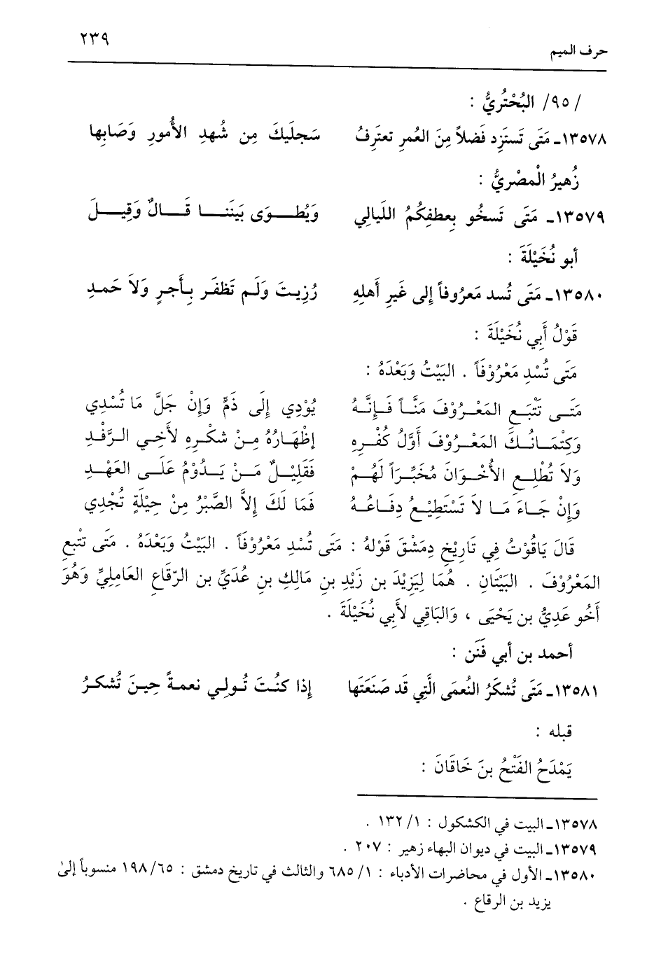 قَالَ يَاقُوْتُ في تَارِيْخِ دِمَشْقَ قَوْلهُ: مَتَى تُسْدِ مَعْرُوْفًا. البَيْتُ وَبَعْدَهُ. مَتَى تتْبعِ المَعْرُوْفَ. البَيْتَانِ. هُمَا لِيَزِيْدَ بن زَيْدِ بنِ مَالِكِ بنِ عُدَيِّ بن الرّقَاعِ العَامِلِيِّ وَهُوَ أَخُو عَدِيُّ بن يَحْيَى، وَالبَاقِي لأَبِي نُخَيْلَةَ.