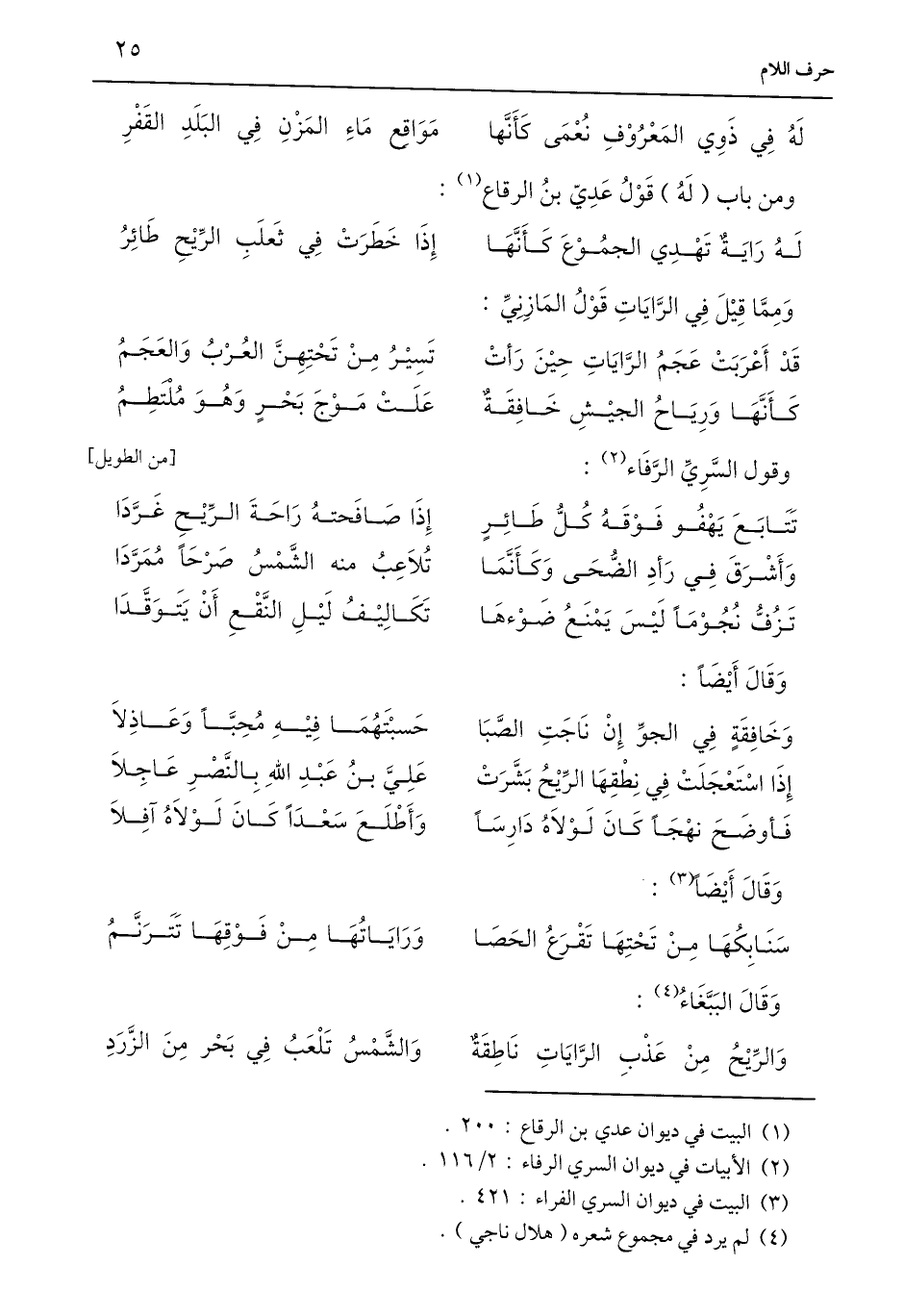 وَالرِّيْحُ مِنْ عَذْبِ الرَّايَاتِ نَاطِقَةٌ ... وَالشَّمْسُ تَلْعَبُ فِي بَحْر مِنَ الزَّرَدِ