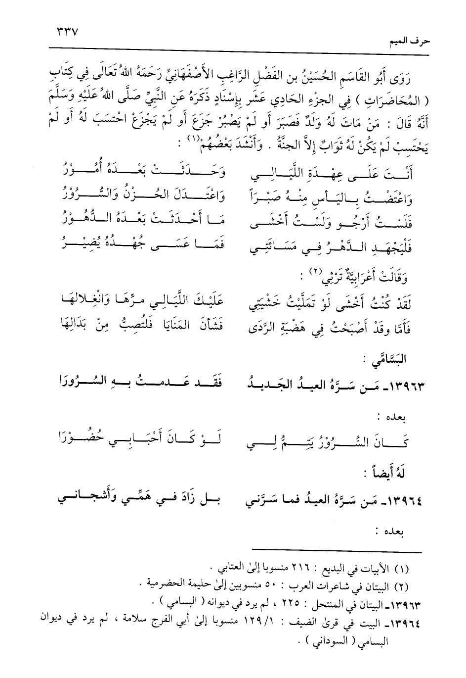 رَوَى أَبُو القَاسَمِ الحُسَيْنُ بن الفَضْلِ الرَّاغِبِ الأَصْفَهَانِيِّ رَحَمَهُ اللَّهُ تَعَالَى فِي كِتَابِ (المُحَاضَرَاتِ) فِي الجزْءِ الحَادِي عَشَر بِإِسْنَادٍ ذَكَرَهُ عَنِ النَّبِيِّ صَلَّى اللَّهُ عَلَيْهِ وَسَلَّمَ أَنَّهُ قَالَ: مَنْ مَاتَ لَهُ وَلدٌ فَصَبَرَ أَو لَمْ يَصْبُرْ جَزَعَ أَو لَمْ يَجْزَعْ احْتسَبَ لَهُ أَو لَمْ يَحْتَسِبْ لَمْ يَكُنْ لَهُ ثَوَابٌ إِلَّا الجنَّةُ. وَأَنْشَدَ بَعْضُهُمْ (¬1):