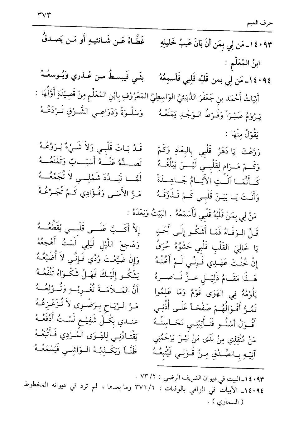 14094 - الأبيات في الوافي بالوفيات: 6/ 376 وما بعدها، لم ترد في ديوانه المخطوط (السماوي).