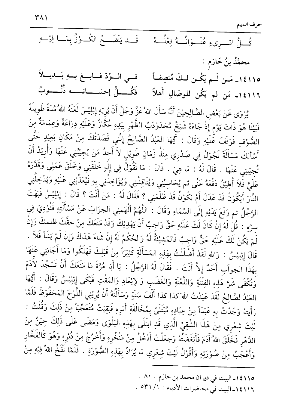 يُرْوَى عَنْ بَعْضِ الصَّالِحِيْنَ أَنَّهُ سَأَلَ اللَّهُ عَزَّ وَجَلَّ أَنْ يُرِيْهِ إِبْلِيْسَ لَعَنَهُ اللَّهُ مُدَةً طَوِيلَةً فَبَيْنَا هُوَ ذَاتَ يَوْمٍ إِذْ جَاءَهُ شَيْخ مُحْدَوْدَبُ الظَّهْرِ بِيَدِهِ عُكَّازٌ وَعَلَيْهِ دِرَاعَةٌ وَعِمَامَةٌ مِنَ الصُّوْفِ فَوَقَفَ عَلَيْهِ وَقَالَ: أَيُّهَا العَبْدُ الصَّالِحُ إِنَّني قَصَدْتُكَ مِنْ مَكَانٍ بَعِيْدٍ حَتَّى أَسْألكَ مَسْأَلَةً تَجُوْلُ فِي صَدْرِي مِنْذُ زَمَانٍ طَوِيْلٍ لَا أَجِدُ مَنْ يُجِيْبُنِي عَنْهَا وَأُرِيْدُ أَنْ تُجِيْبنِي عَنْهَا. قَالَ لَهُ: مَا هِيَ. قَالَ: مَا تَقُوْلُ فِي إِلَهٍ خَلَقَنِي وَخَلَقَ عَمَلِي وَقَدَّرَهُ عَلَى فَلَا أُطِيْقُ دَفْعَهُ عَنِّي ثم يُحَاسِبُنِي وَيُنَاقِشُنِي وَيُؤَاخِذُنِي بِهِ فَيُعَذِّبُنِي عَلَيْهِ وَيُدْخِلُنِي النَّارَ أَيَكُوْنُ قَدْ عَدَلَ أَمْ يَكُوْنُ قَدْ ظَلَمَنِي؟ فَقَالَ لَهُ: مَنْ أَنْتَ؟ قَالَ: إِبْلِيْسُ فَبَهَتَ الرَّجُلُ ثم رَفَعَ يَدَيْهِ إِلَى السَّمَاءِ وَقَالَ: اللَّهُمَّ ألْهَمْنِي الجوَابَ عَنْ مَسْأَلَتِهِ فَنُوْدِيَ فِي سِرِّهِ: قُلْ لَهُ إِنْ كَانَ لَكَ عَلَيْهِ حَقٌّ وَاجِبٌ أَنْ يَهْدِيْكَ وَقَدْ مَنَعَكَ مِنْ حقَّكَ ظلمكَ وَإِنْ لَمْ يَكُنْ لَكَ عَلَيْهِ حَقٌّ وَاجِبٌ فَالمَشِيْئَةُ لَهُ وَالحُكْمُ لَهُ إِنْ شَاءَ هَدَاكَ وَإِنْ لَمْ يَشَأ فَلَا. قَالَ إِبْلِيْسُ: وَاللَّهِ لَقَدْ أَضْلَلْتُ بِهَذِهِ المَسْأَلَةِ كَثِيْرًا مِنْ قَبْلِكَ فَهَلَكُوا وَمَا أَجَابَنِي عَنهَا بِهَذَا الجوَابِ أَحَدٌ إِلَّا أَنْتَ. فَقَالَ لَهُ الرَّجُلُ: يَا أَبَا مُرَّةَ مَا مَنَعَكَ أَنْ تَسْجُدَ لآدَمَ وَتُكْفَى شَرَّ هَذِهِ الفِتْنَةِ وَاللَّعْنَةِ وَالغَضَبِ وَالإِبْعَادِ وَالمَقْتِ فَبَكَى إِبْلِيْسُ وَقَالَ: أَيُّهَا العَبْدُ الصَّالِحُ لَقَدْ عَبَدْتُ اللَّهَ كذا كذا أَلْفَ سَنَةٍ وَسَأَلْتُهُ أَنْ يُرِيْنِي اللَّوْحَ المَحْفُوْظَ فَلَمَّا رَأَيتهُ وَجَدْتُ بِهِ عَبْدًا مِنْ عِبَادِهِ مُبْتَلًى بِمُخَالَفَةِ أَمْرِهِ فَبَقِيْتُ مُتَعَجِّبًا مِنْ ذَلِكَ وَقُلْتُ: لَيْتَ شِعْرِي مِنْ هَذَا الشَّقِيِّ الَّذِي قَدِ ابتَلَى بِهَذِهِ البَلْوَى وَمَضَى عَلَى ذَلِكَ حِيْنٌ مِنَ الدَّهْرِ فَخَلَقَ اللَّهُ آدَمَ فَأَبْغَضْتُهُ وَجعَلْتُ أَدْخُلُ مِنْ مَنْخُرِهِ وَأَخْرُجُ مِنْ دُبْرِهِ وَهُوَ كَالفَخَّارِ وَأَعْجَبُ مِنْ صُوْرَتهِ وَأَقُوْلُ لَيْتَ شِعْرِي مَا يُرَادُ بِهَذِهِ الصُّوْرَةِ. فَلَمَّا نَفَخُ اللَّهُ فِيْهِ مِنْ