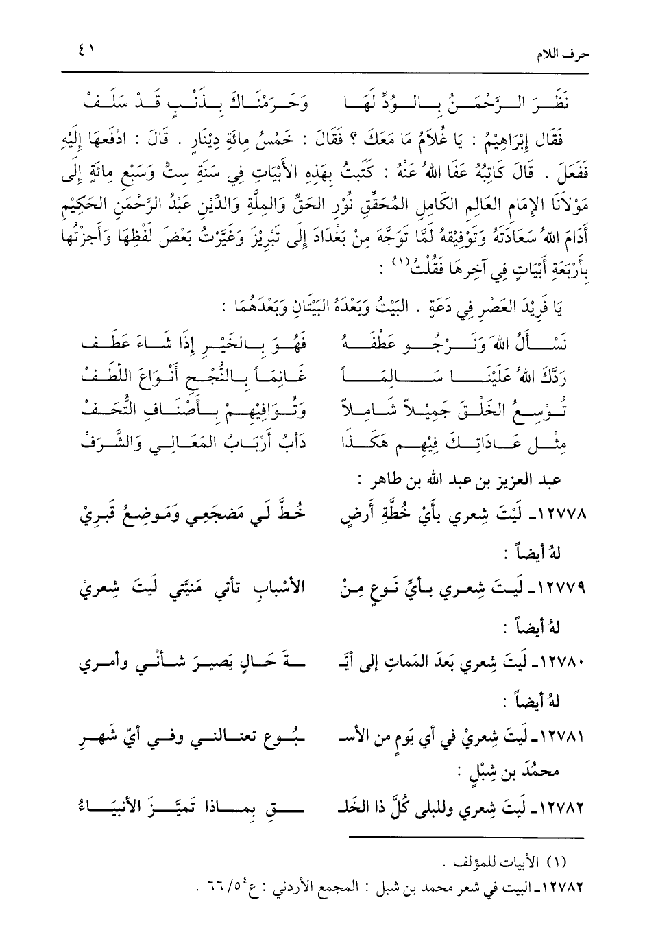 فَقَال إِبْرَاهِيْمُ: يَا غُلَامُ مَا مَعَكَ؟ فَقَالَ: خَمْسُ مِائَةِ دِيْنَارٍ. قَالَ: ادْفَعهَا إِلَيْهِ فَفَعَلَ. قَالَ كَاتِبُهُ عَفَا اللَّهُ عَنْهُ: كَتَبتُ بِهَذِهِ الأَبْيَاتِ فِي سَنَةِ سِتٍّ وَسَبع مِائَةٍ إِلَى مَوْلَانَا الإِمَامِ العَالِمِ الكَامِلِ المُحَقِّقِ نُوْرِ الحَقِّ وَالمِلَّةِ وَالدِّيْنِ عَبْدُ الرَّحْمَنِ الحَكِيْمِ أَدَامَ اللَّهُ سَعَادَتَهُ وَتَوْفيْقهُ لَمَّا تَوَجَّهَ مِنْ بَغْدَادَ إِلَى تَبْرِيْزَ وَغَيَّرْتُ بَعْضَ لَفْظِهَا وَأَجزْتُها بِأَرْبَعَةِ أَبْيَاتٍ فِي آخِرهَا فَقُلْتُ (¬1):