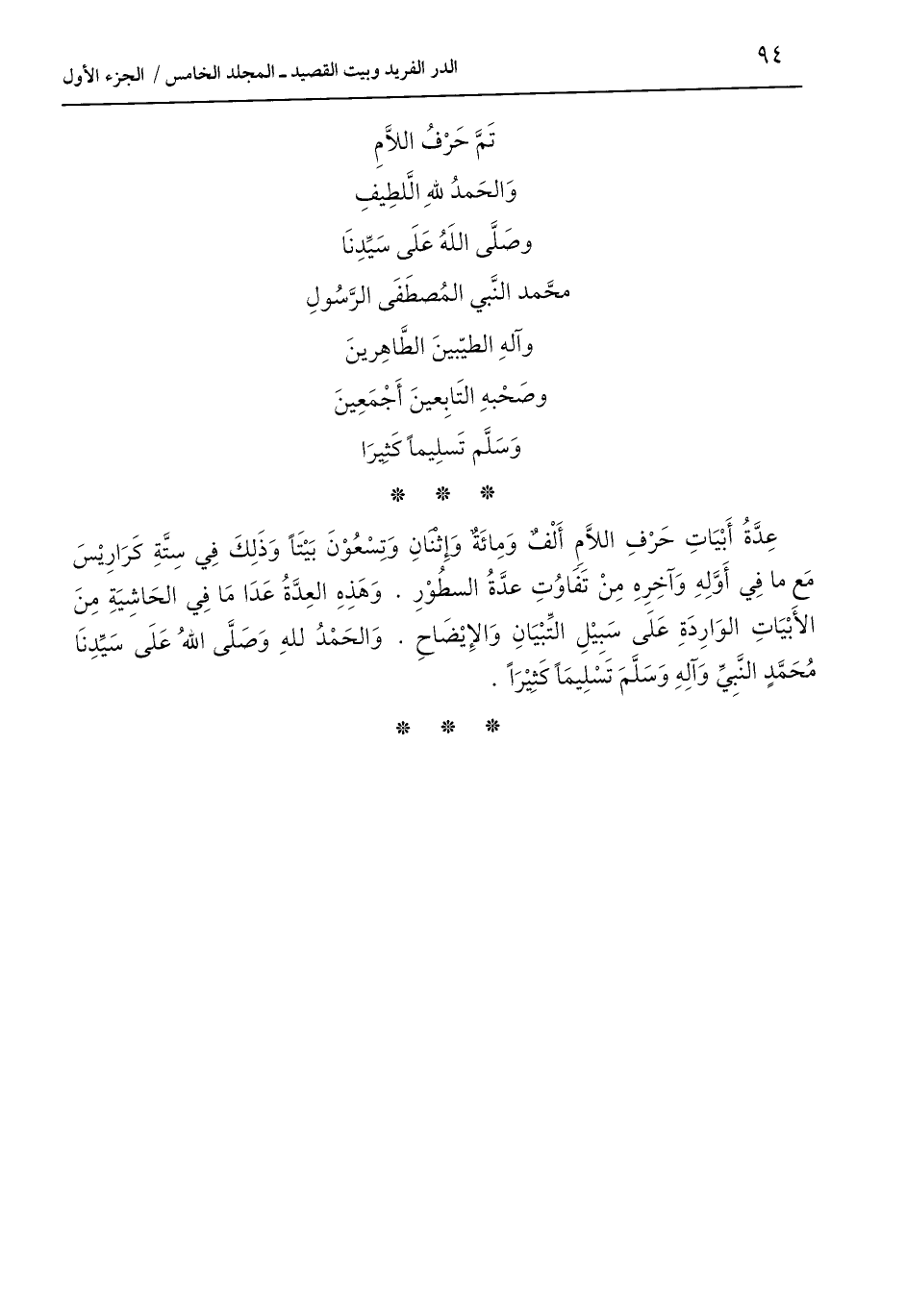 عِدَّةُ أَبْيَاتِ حَرْفِ اللَّامِ أَلْفٌ وَمِائَةٌ وَإِثنانِ وَتِسْعُوْنَ بَيْتًا وَذَلِكَ فِي سِتَّةِ كَرَارِيْسَ مَع ما فِي أَوَّلِهِ وَآخِرِهِ مِنْ تَفَاوُتِ عدَّةُ السطُوْرِ. وَهَذِهِ العِدَّةُ عَدَا مَا فِي الحَاشِيَةِ مِنَ الأَبْيَاتِ الوَارِدَةِ عَلَى سَبيْلِ التِّبْيَانِ وَالإِيْضَاحِ. وَالحَمْدُ للَّهِ وَصلَّى اللَّهُ عَلَى سَيِّدِنَا مُحَمَّدٍ النَّبِيِّ وَآلِهِ وَسَلَّمَ تَسلِيمًا كَثِيْرًا.