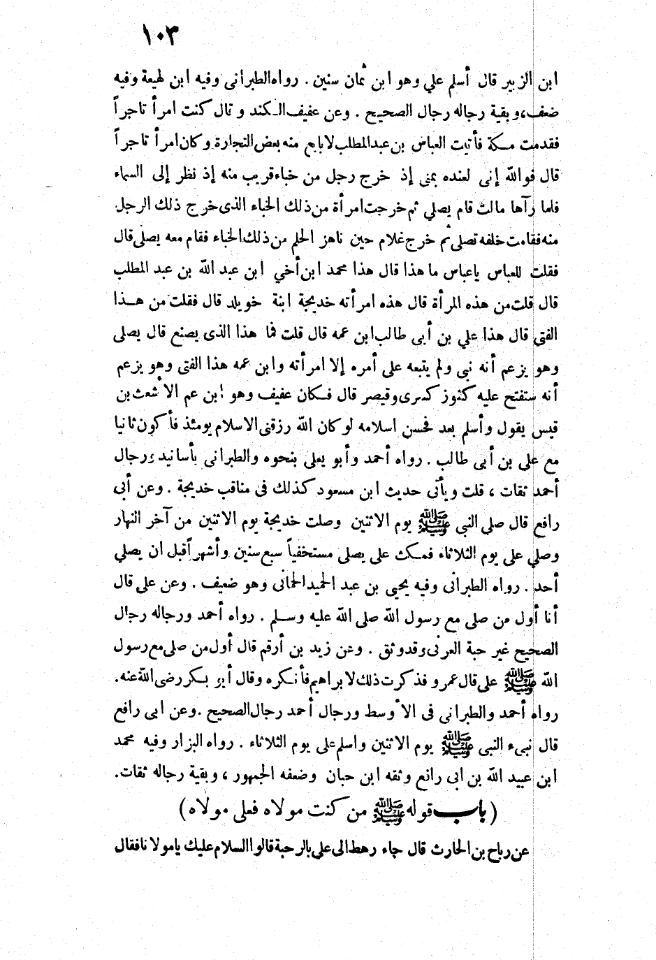 14606 - «وَعَنْ أَبِي رَافِعٍ قَالَ: صَلَّى النَّبِيُّ - صَلَّى اللَّهُ عَلَيْهِ وَسَلَّمَ - يَوْمَ الِاثْنَيْنِ، وَصَلَّتْ خَدِيجَةُ يَوْمَ الِاثْنَيْنِ مِنْ آخِرِ النَّهَارِ، وَصَلَّى عَلِيٌّ يَوْمَ الثُّلَاثَاءِ، فَمَكَثَ عَلِيٌّ يُصَلِّي مُسْتَخْفِيًا سَبْعَ سِنِينَ وَأَشْهُرًا قَبْلَ أَنْ يُصَلِّيَ أَحَدٌ».