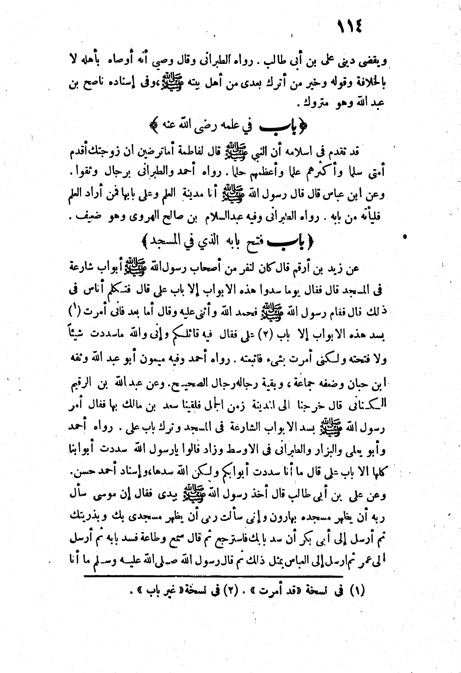 14673 - «وَعَنْ عَلِيِّ بْنِ أَبِي طَالِبٍ قَالَ: أَخَذَ رَسُولُ اللَّهِ - صَلَّى اللَّهُ عَلَيْهِ وَسَلَّمَ - بِيَدِي، فَقَالَ: " إِنَّ مُوسَى سَأَلَ رَبَّهُ أَنْ يَظْهَرَ مَسْجِدُهُ بِهَارُونَ، وَإِنِّي سَأَلْتُ رَبِّي أَنْ يَظْهَرَ مَسْجِدِي بِكَ وَبِذُرِّيَّتِكَ ". ثُمَّ أَرْسَلَ إِلَى أَبِي بَكْرٍ: " أَنْ سُدَّ بَابِكَ ". فَاسْتَرْجَعَ، ثُمَّ قَالَ: سَمْعٌ وَطَاعَةٌ، فَسَدَّ بَابَهُ، ثُمَّ أَرْسَلَ إِلَى عُمَرَ، ثُمَّ أَرْسَلَ إِلَى الْعَبَّاسِ بِمِثْلِ ذَلِكَ. ثُمَّ قَالَ رَسُولُ اللَّهِ - صَلَّى اللَّهُ عَلَيْهِ وَسَلَّمَ -: " مَا أَنَا