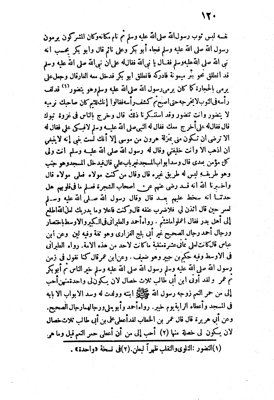 قَالَ: وَجَعَلَ عَلِيٌّ يُرْمَى بِالْحِجَارَةِ، كَمَا كَانَ يُرْمَى رَسُولُ اللَّهِ - صَلَّى اللَّهُ عَلَيْهِ وَسَلَّمَ - وَهُوَ يَتَضَوَّرُ قَدْ لَفَّ رَأْسَهُ فِي الثَّوْبِ لَا يُخْرِجُهُ حَتَّى أَصْبَحَ، ثُمَّ كَشَفَ رَأْسَهُ، فَقَالُوا: إِنَّكَ لَلَئِيمٌ، كَانَ صَاحِبُكَ نَرْمِيهِ لَا يَتَضَوَّرُ وَأَنْتَ تَتَضَوَّرُ، وَقَدِ اسْتَنْكَرْنَا ذَلِكَ. قَالَ: وَخَرَجَ بِالنَّاسِ فِي غَزْوَةِ تَبُوكَ قَالَ: فَقَالَ لَهُ عَلِيٌّ: أَخْرُجُ مَعَكَ، فَقَالَ لَهُ النَّبِيُّ - صَلَّى اللَّهُ عَلَيْهِ وَسَلَّمَ -: " لَا ". فَبَكَى عَلِيٌّ، فَقَالَ لَهُ: " «أَلَا تَرْضَى أَنْ تَكُونَ مِنِّي بِمَنْزِلَةِ هَارُونَ مِنْ مُوسَى؟ إِلَّا أَنَّكَ لَسْتَ بِنَبِيٍّ، إِنَّهُ لَا يَنْبَغِي أَنْ أَذْهَبَ إِلَّا وَأَنْتَ خَلِيفَتِي» ". وَقَالَ لَهُ رَسُولُ اللَّهِ - صَلَّى اللَّهُ عَلَيْهِ وَسَلَّمَ -: " «أَنْتَ وَلِيُّ كُلِّ مُؤْمِنٍ بَعْدِي» ". قَالَ: وَسَدَّ أَبْوَابَ الْمَسْجِدِ غَيْرَ بَابِ عَلِيٍّ قَالَ: فَيَدْخُلُ الْمَسْجِدَ، جَنْبٌا، وَهُوَ طَرِيقُهُ لَيْسَ لَهُ طَرِيقٌ غَيْرَهُ. قَالَ: وَقَالَ: " «مَنْ كُنْتُ مَوْلَاهُ فَعَلِيٌّ مَوْلَاهُ» ". قَالَ: وَأَخْبَرَنَا اللَّهُ [عَزَّ وَجَلَّ - فِي الْقُرْآنِ] أَنَّهُ قَدْ رَضِيَ عَنْهُمْ، عَنْ أَصْحَابِ الشَّجَرَةِ، فَعَلِمَ مَا فِي قُلُوبِهِمْ، هَلْ حَدَّثَنَا أَنَّهُ سَخِطَ عَلَيْهِمْ بَعْدُ؟ قَالَ: وَقَالَ رَسُولُ اللَّهِ - صَلَّى اللَّهُ عَلَيْهِ وَسَلَّمَ - لِعُمَرَ حِينَ قَالَ: ائْذَنْ لِي فَلْأَضْرِبْ عُنُقَهُ قَالَ: " وَكُنْتَ فَاعِلًا، وَمَا يُدْرِيكَ لَعَلَّ اللَّهَ اطَّلَعَ إِلَى أَهْلِ بَدْرٍ فَقَالَ: اعْمَلُوا مَا شِئْتُمْ ".