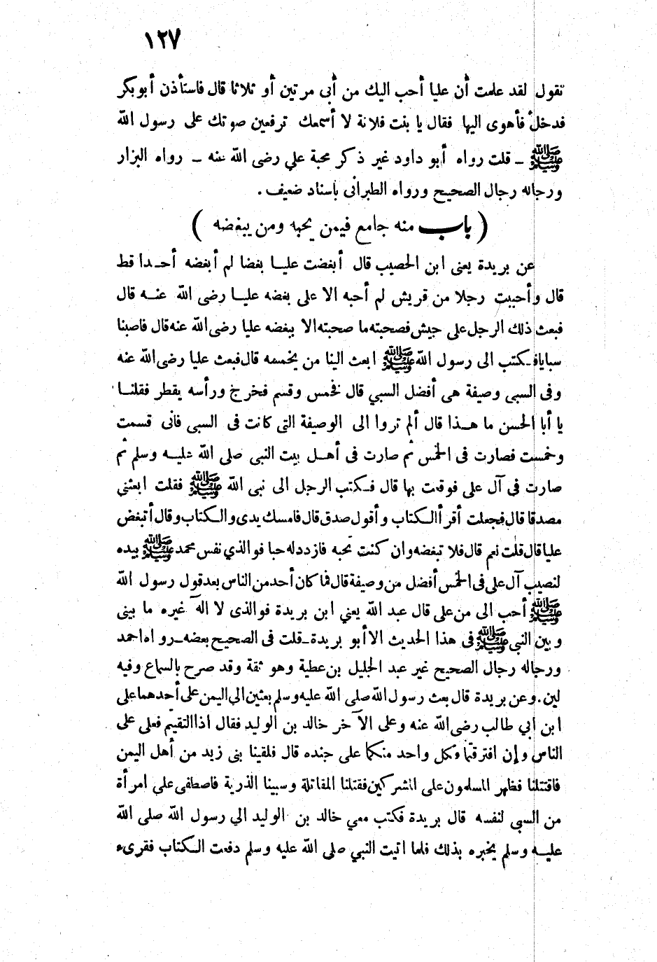 قَالَ: فَبُعِثَ ذَلِكَ الرَّجُلُ عَلَى جَيْشٍ، فَصَحِبْتُهُ مَا صَحِبْتُهُ إِلَّا بِبُغْضِهِ عَلِيًّا - رَضِيَ اللَّهُ عَنْهُ - قَالَ: فَأَصَبْنَا سَبَايَا فَكَتَبَ إِلَى رَسُولِ اللَّهِ - صَلَّى اللَّهُ عَلَيْهِ وَسَلَّمَ -: ابْعَثْ إِلَيْنَا مَنْ يُخَمِّسُهُ. قَالَ: فَبَعَثَ [إِلَيْنَا] عَلِيًّا - رَضِيَ اللَّهُ عَنْهُ - وَفِي السَّبْيِ وَصِيفَةٌ هِيَ أَفْضَلُ السَّبْيِ قَالَ: فَخَمَّسَ وَقَسَّمَ، فَخَرَجَ وَرَأْسُهُ يَقْطُرُ، فَقُلْنَا: يَا أَبَا الْحَسَنِ، مَا هَذَا؟ قَالَ: أَلَمْ تَرَوْا إِلَى الْوَصِيفَةِ الَّتِي كَانَتْ فِي السَّبْيِ فَإِنِّي قَسَّمْتُ وَخَمَّسْتُ، فَصَارَتْ فِي الْخُمْسِ، ثُمَّ صَارَتْ فِي أَهْلِ بَيْتِ النَّبِيِّ - صَلَّى اللَّهُ عَلَيْهِ وَسَلَّمَ - ثُمَّ صَارَتْ فِي آلِ عَلِيٍّ فَوَقَعْتُ بِهَا. قَالَ: فَكَتَبَ الرَّجُلُ إِلَى نَبِيِّ اللَّهِ - صَلَّى اللَّهُ عَلَيْهِ وَسَلَّمَ - فَقُلْتُ: ابْعَثْنِي مُصَدِّقًا قَالَ: فَجَعَلْتُ أَقْرَأُ الْكِتَابَ، وَأَقُولُ: صَدَقَ قَالَ: فَأَمْسَكَ يَدِي وَالْكِتَابَ، وَقَالَ: " أَتُبْغِضُ عَلِيًّا؟ ". قَالَ: قُلْتُ: نَعَمْ. قَالَ: " فَلَا تُبْغِضُهُ، وَإِنْ كُنْتَ تُحِبُّهُ فَازْدَدْ لَهُ حُبًّا، فَوَالَّذِي نَفْسُ مُحَمَّدٍ - صَلَّى اللَّهُ عَلَيْهِ وَسَلَّمَ - بِيَدِهِ لَنَصِيبُ آلِ عَلِيٍّ فِي الْخُمْسِ أَفْضَلُ مِنْ وَصِيفَةٍ ". قَالَ: فَمَا كَانَ أَحَدٌ مِنَ النَّاسِ بَعْدَ قَوْلِ رَسُولِ اللَّهِ - صَلَّى اللَّهُ عَلَيْهِ وَسَلَّمَ - أَحَبَّ إِلَيَّ مِنْ عَلِيٍّ.