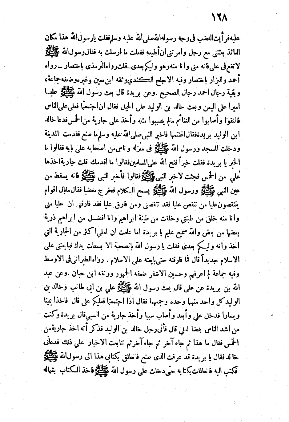 عَلَيْهِ، فَرَأَيْتُ الْغَضَبَ فِي وَجْهِ رَسُولِ اللَّهِ - صَلَّى اللَّهُ عَلَيْهِ وَسَلَّمَ - فَقُلْتُ: يَا رَسُولَ اللَّهِ، هَذَا مَكَانُ الْعَائِذِ، بَعَثْتَنِي مَعَ رَجُلٍ وَأَمَرْتَنِي أَنْ أُطِيعَهُ فَفَعَلْتُ مَا أُرْسِلْتُ بِهِ، فَقَالَ رَسُولُ اللَّهِ - صَلَّى اللَّهُ عَلَيْهِ وَسَلَّمَ -: " «لَا تَقَعْ فِي عَلِيٍّ؛ فَإِنَّهُ مِنِّي وَأَنَا مِنْهُ، وَهُوَ وَلِيُّكُمْ بَعْدِي» ".