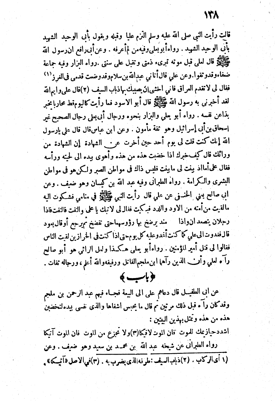 قَالَتْ: رَأَيْتُ «النَّبِيَّ - صَلَّى اللَّهُ عَلَيْهِ وَسَلَّمَ - الْتَزَمَ عَلِيًّا وَقَبَّلَهُ وَيَقُولُ: " بِأَبِي الْوَحِيدُ الشَّهِيدُ!! بِأَبِي الْوَحِيدُ الشَّهِيدُ» ".