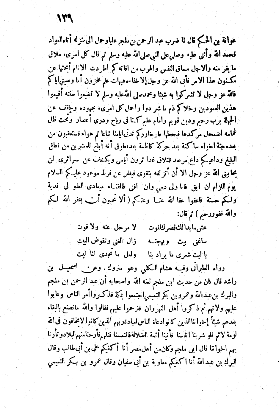 عَوَانَةَ بْنِ الْحَكَمِ قَالَ: لَمَّا ضَرَبَ عَبْدُ الرَّحْمَنِ بْنُ مُلْجَمٍ عَلِيًّا وَحُمِلَ إِلَى مَنْزِلِهِ، أَتَاهُ الْعُوَّادُ فَحَمِدَ اللَّهَ، وَأَثْنَى عَلَيْهِ، وَصَلَّى عَلَى النَّبِيِّ - صَلَّى اللَّهُ عَلَيْهِ وَسَلَّمَ - ثُمَّ قَالَ: كُلُّ امْرِئٍ مُلَاقٍ مَا يَفِرُّ مِنْهُ، وَالْأَجْلُ مَسَاقُ النَّفْسِ، وَالْهَرَبُ مِنْ آفَاتِهِ، كَمِ اطَّرَدْتُ الْأَنَامَ أَبْحَثُهَا عَنْ مَكْنُونِ هَذَا الْأَمْرِ، فَأَبَى اللَّهُ - عَزَّ وَجَلَّ - إِلَّا خَفَاءَهُ، هَيْهَاتَ عِلْمٌ مَخْزُونٌ. أَمَّا وَصِيَّتِي إِيَّاكُمْ فَاللَّهُ - عَزَّ وَجَلَّ - لَا تُشْرِكُوا بِهِ شَيْئًا، وَمُحَمَّدٌ - صَلَّى اللَّهُ عَلَيْهِ وَسَلَّمَ - لَا تُضَيِّعُوا سُنَّتَهُ، أَقِيمُوا هَذَيْنِ الْعَمُودَيْنِ، وَخَلَاكُمْ ذَمُّ مَا لَمْ تَشْرُدُوا، وَأُحَمِّلُ كُلَّ امْرِئٍ مَجْهُودَهُ، وَخُفِّفَ عَنِ الْجَهَلَةِ بِرَبٍّ رَحِيمٍ، وَدِينٍ قَوِيمٍ، وَإِمَامٍ عَلِيمٍ، كُنَّا فِي رِيَاحٍ وَذُرْيِ أَغْصَانٍ، وَتَحْتَ ظِلِّ غَمَامَةٍ اضْمَحَلَّ مَرْكَزُهَا فَيَحُطُّهَا عَلُوٌّ خَاوَرَكُمْ تَدَنِّي أَيَّامِنَا تِبَاعًا، ثُمَّ هَوَاءً فَسَتَعْقُبُونَ مِنْ بَعْدِهِ جُثَّةً خَوَاءً سَاكِنَةً بَعْدَ حَرَكَةٍ كَاظِمَةً، بَعْدَ نُطُوقِ أَنَّهُ أَبْلَغُ لِلْمُعْتَبِرِينَ مِنْ نُطْقِ الْبَلِيغِ، وَدَاعِيكُمْ دَاعٍ مُرْصَدٌ لِلتَّلَاقِ، غَدًا تَرَوْنَ أَيَّامِي، وَيُكْشَفُ عَنْ سَرَائِرِي، لَنْ يُحَابِيَنِي اللَّهُ - عَزَّ وَجَلَّ - إِلَّا أَنْ أَتَزَلَّفَهُ بِتَقْوًى فَيَغْفِرَ عَنْ فَرْطِ مَوْعُودٍ، عَلَيْكُمُ السَّلَامُ يَوْمَ اللِّزَامِ إِنْ أَبْقَ فَأَنَا وَلِيُّ دَمِي، وَإِنْ أَفْنَى فَالْفَنَاءُ مِيعَادِي، الْعَفْوُ لِي فَدِيَةٌ وَلَكُمْ حَسَنَةٌ، فَاعْفُوا عَفَا اللَّهُ عَنَّا وَعَنْكُمْ " أَلَا تُحِبُّونَ أَنْ يَغْفِرَ اللَّهُ لَكُمْ وَاللَّهُ غَفُورٌ رَحِيمٌ ". ثُمَّ قَالَ: