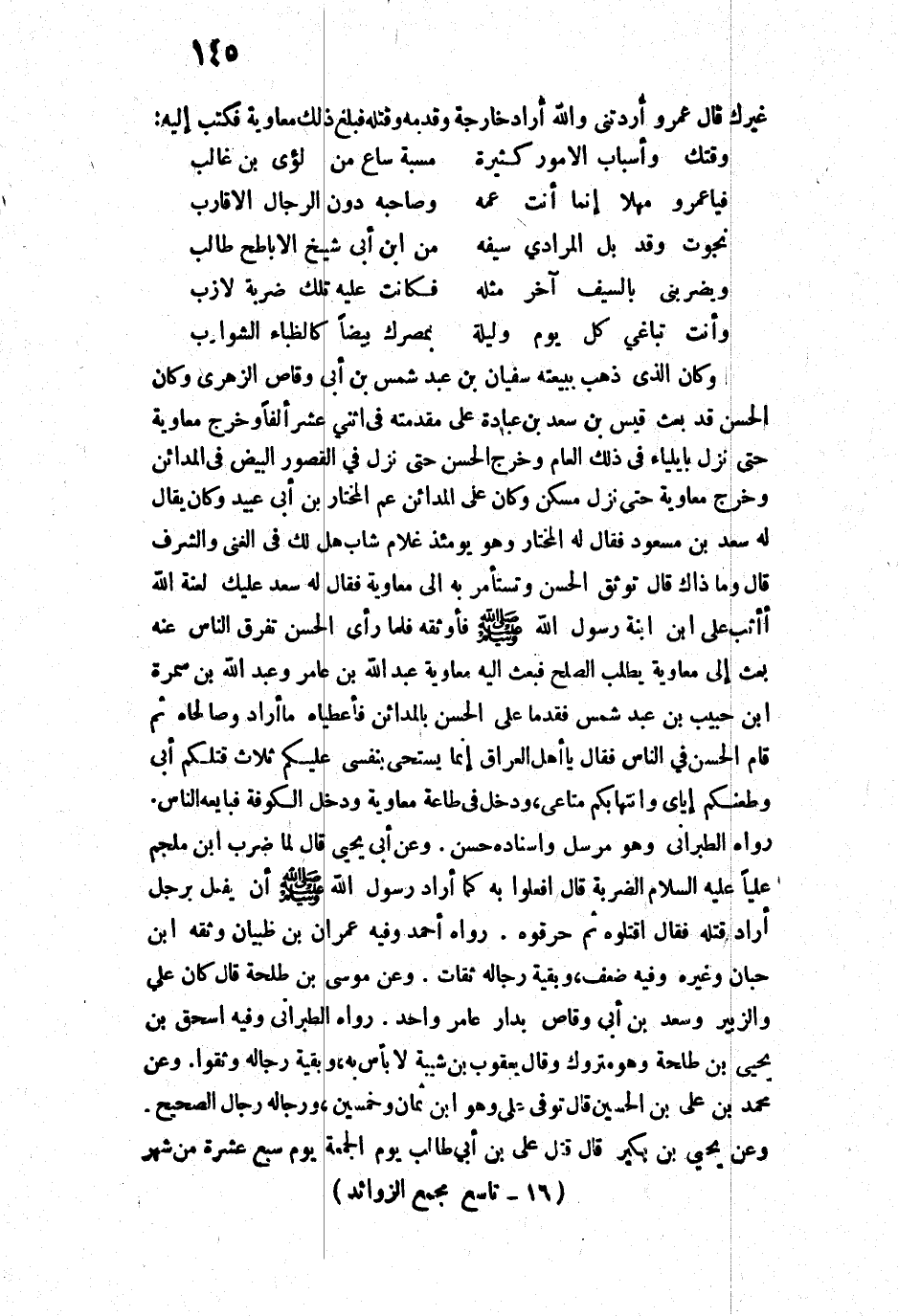 نَجَوْتَ وَقَدْ بَلَّ الْمُرَادِيُّ سَيْفَهُ مِنَ ابْنِ أَبِي شَيْخِ الْأَبَاطِحِ طَالِبِ ... وَيَضْرِبُنِي بِالسَّيْفِ آخَرُ مِثْلُهُ فَكَانَتْ عَلَيْهِ تِلْكَ ضَرْبَةُ لَازِبِ