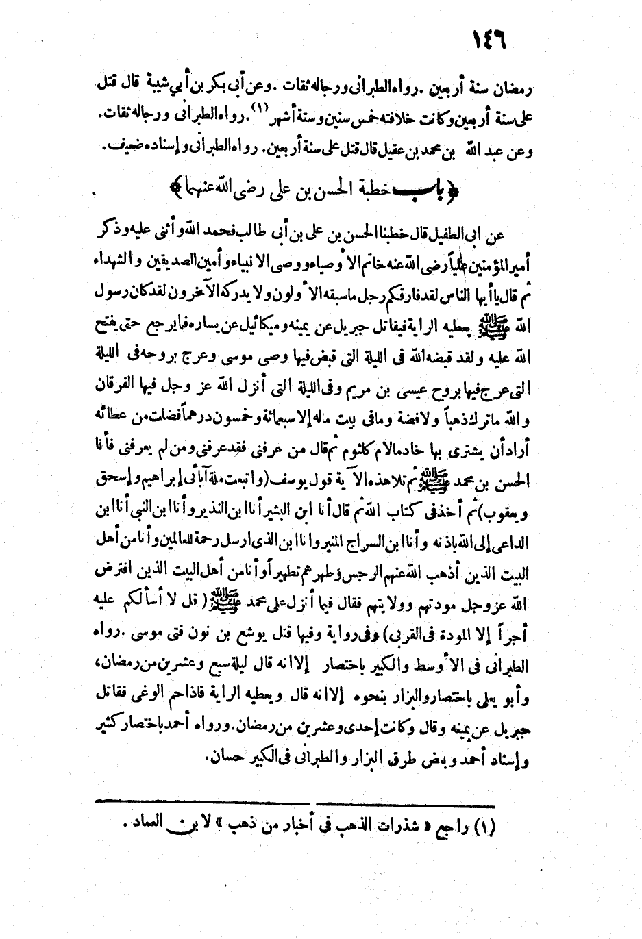 14798 - عَنْ أَبِي الطُّفَيْلِ قَالَ: خَطَبَنَا الْحَسَنُ بْنُ عَلِيِّ بْنِ أَبِي طَالِبٍ، فَحَمِدَ اللَّهَ وَأَثْنَى عَلَيْهِ، وَذَكَرَ أَمِيرَ الْمُؤْمِنِينَ عَلِيًّا - رَضِيَ اللَّهُ عَنْهُ - خَاتَمَ الْأَوْصِيَاءِ، وَوَصِيَّ الْأَنْبِيَاءِ، وَأَمِينَ الصِّدِّيقِينَ وَالشُّهَدَاءِ، ثُمَّ قَالَ: