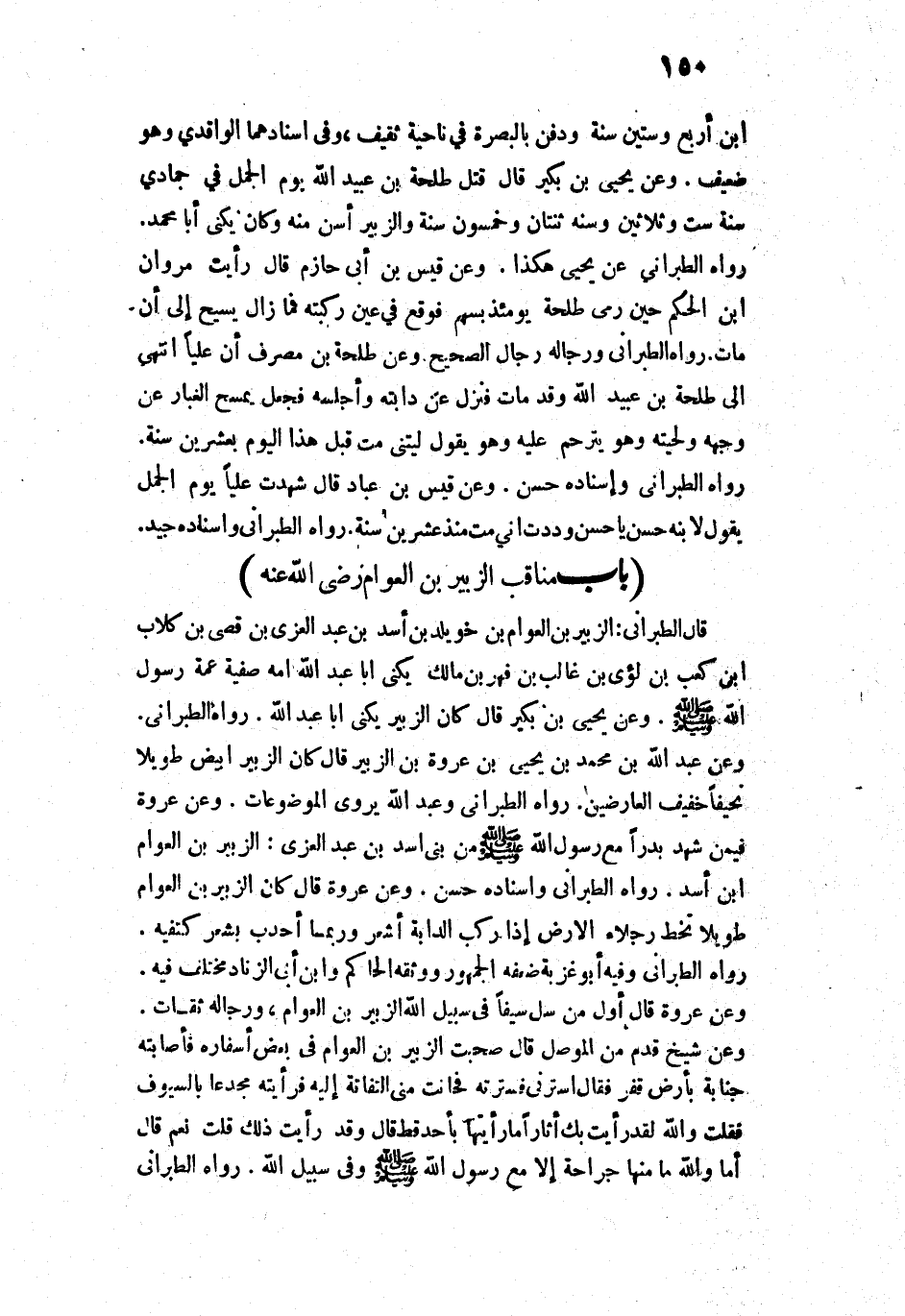 14831 - «وَعَنْ شَيْخٍ قَدِمَ مِنَ الْمَوْصِلِ قَالَ: صَحِبْتُ الزُّبَيْرَ بْنَ الْعَوَّامِ فِي بَعْضِ أَسْفَارِهِ، فَأَصَابَتْهُ جَنَابَةٌ بِأَرْضٍ قَفْرٍ، فَقَالَ: اسْتُرْنِي، فَسَتَرْتُهُ فَحَانَتْ مِنِّي الْتِفَاتَةٌ إِلَيْهِ، فَرَأَيْتُهُ مُجَدَّعًا بِالسُّيُوفِ، فَقُلْتُ: وَاللَّهِ لَقَدْ رَأَيْتُ بِكَ أَثَارًا مَا رَأَيْتُهَا بِأَحَدٍ قَطُّ! قَالَ: وَقَدْ رَأَيْتَ ذَلِكَ؟ قُلْتُ: نَعَمْ. قَالَ: أَمَا وَاللَّهِ مَا مِنْهَا جِرَاحَةٌ إِلَّا مَعَ رَسُولِ اللَّهِ - صَلَّى اللَّهُ عَلَيْهِ وَسَلَّمَ - وَفِي سَبِيلِ اللَّهِ».