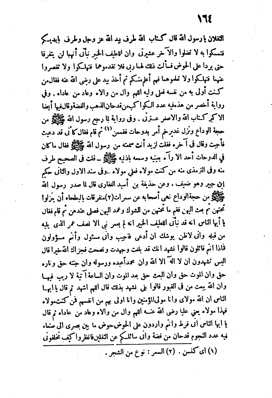 14966 - عَنْ حُذَيْفَةَ بْنِ أَسِيدٍ الْغِفَارِيِّ قَالَ: «لَمَّا صَدَرَ رَسُولُ اللَّهِ - صَلَّى اللَّهُ عَلَيْهِ وَسَلَّمَ - مِنْ حَجَّةِ الْوَدَاعِ، نَهَى أَصْحَابَهُ عَنْ سَمُرَاتٍ مُتَفَرِّقَاتٍ بِالْبَطْحَاءِ أَنْ يَنْزِلُوا تَحْتَهُنَّ، ثُمَّ بَعَثَ إِلَيْهِنَّ، فَقُمَّ مَا تَحْتَهُنَّ مِنَ الشَّوْكِ، وَعَمَدَ إِلَيْهِنَّ فَصَلَّى عِنْدَهُنَّ، ثُمَّ قَامَ فَقَالَ: " يَا أَيُّهَا النَّاسُ، إِنَّهُ قَدْ نَبَّأَنِي اللَّطِيفُ الْخَبِيرُ أَنَّهُ لَمْ يُعَمَّرْ نَبِيٌّ إِلَّا نِصْفَ عُمُرِ الَّذِي يَلِيهِ مِنْ قَبْلِهِ، وَإِنِّي لَأَظُنُّ يُوشِكُ أَنْ أُدْعَى فَأُجِيبَ، وَإِنِّي مَسْئُولٌ وَأَنْتُمْ مَسْئُولُونَ، فَمَاذَا أَنْتُمْ قَائِلُونَ؟ ". قَالُوا: نَشْهَدُ أَنَّكَ قَدْ بَلَّغْتَ، وَجَهَدْتَ، وَنَصَحْتَ، فَجَزَاكَ اللَّهُ خَيْرًا. قَالَ: " أَلَيْسَ تَشْهَدُونَ أَنْ لَا إِلَهَ إِلَّا اللَّهُ، وَأَنَّ مُحَمَّدًا عَبْدُهُ وَرَسُولُهُ، وَأَنَّ جَنَّتَهُ حَقٌّ، وَنَارَهُ حَقٌّ، وَأَنَّ الْمَوْتَ حَقٌّ، وَأَنَّ الْبَعْثَ حَقٌّ بَعْدَ الْمَوْتِ، وَأَنَّ السَّاعَةَ آتِيَةٌ لَا رَيْبَ فِيهَا، وَأَنَّ اللَّهَ يَبْعَثُ مَنْ فِي الْقُبُورِ؟ ". قَالُوا: بَلَى، نَشْهَدُ بِذَلِكَ. قَالَ: " اللَّهُمَّ اشْهَدْ ". ثُمَّ قَالَ: " يَا أَيُّهَا النَّاسُ، إِنَّ اللَّهَ مَوْلَايَ، وَأَنَا مَوْلَى الْمُؤْمِنِينَ، وَأَنَا أَوْلَى بِهِمْ مِنْ أَنْفُسِهِمْ، فَمَنْ كُنْتُ مَوْلَاهُ فَهَذَا مَوْلَاهُ ". - يَعْنِي عَلِيًّا - رَضِيَ اللَّهُ عَنْهُ - " اللَّهُمَّ وَالِ مَنْ وَالَاهُ، وَعَادِ مَنْ عَادَاهُ ". ثُمَّ قَالَ: " يَا أَيُّهَا النَّاسُ، إِنِّي فَرَطٌ وَأَنْتُمْ وَارِدُونَ عَلَى الْحَوْضِ، حَوْضٌ أَعْرَضُ مَا بَيْنَ بُصْرَى إِلَى صَنْعَاءَ، فِيهِ عَدَدُ النُّجُومِ قِدْحَانُ مِنْ فِضَّةٍ، وَإِنِّي سَائِلُكُمْ حِينَ تَرِدُونَ عَلَيَّ عَنِ الثَّقَلَيْنِ، فَانْظُرُوا كَيْفَ تَخْلُفُونِي