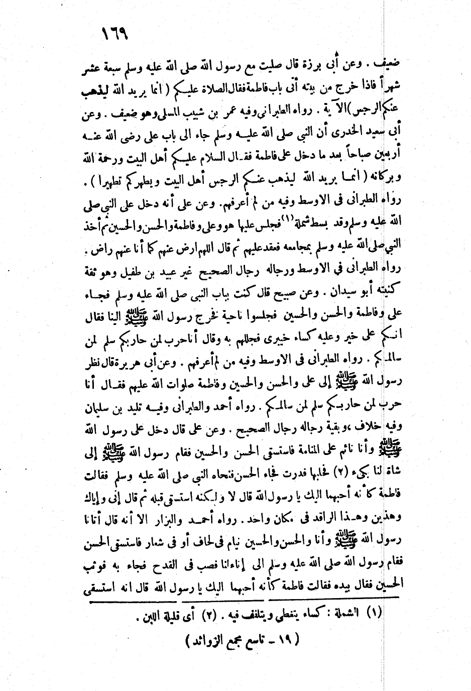 14989 - «وَعَنْ صُبَيْحٍ قَالَ: كُنْتُ بِبَابِ النَّبِيِّ - صَلَّى اللَّهُ عَلَيْهِ وَسَلَّمَ - فَجَاءَ عَلِيٌّ، وَفَاطِمَةُ، وَالْحَسَنُ، وَالْحُسَيْنُ، فَجَلَسُوا نَاحِيَةً، فَخَرَجَ رَسُولُ اللَّهِ - صَلَّى اللَّهُ عَلَيْهِ وَسَلَّمَ - إِلَيْنَا، فَقَالَ: " إِنَّكُمْ عَلَى خَيْرٍ ". وَعَلَيْهِ كِسَاءٌ خَيْبَرِيٌّ، فَجَلَّلَهُمْ بِهِ، وَقَالَ: " أَنَا حَرْبٌ لِمَنْ حَارَبَكُمْ، سِلْمٌ لِمَنْ سَالَمَكُمْ».