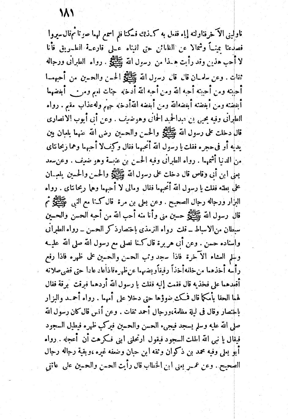 15072 - «وَعَنْ سَلْمَانَ قَالَ: قَالَ رَسُولُ اللَّهِ - صَلَّى اللَّهُ عَلَيْهِ وَسَلَّمَ -: " الْحَسَنُ وَالْحُسَيْنُ مَنْ أَحَبَّهُمَا أَحْبَبْتُهُ، وَمَنْ أَحْبَبْتُهُ أَحَبَّهُ اللَّهُ، وَمَنْ أَحَبَّهُ اللَّهُ أَدْخَلَهُ جَنَّاتِ نَعِيمٍ، وَمَنْ أَبْغَضَهُمَا أَوْ بَغَى عَلَيْهِمَا أَبْغَضْتُهُ، وَمَنْ أَبْغَضْتُهُ أَبْغَضَهُ اللَّهُ، وَمَنْ أَبْغَضَهُ اللَّهُ أَدْخَلَهُ جَهَنَّمَ، وَلَهُ عَذَابٌ مُقِيمٌ» ".