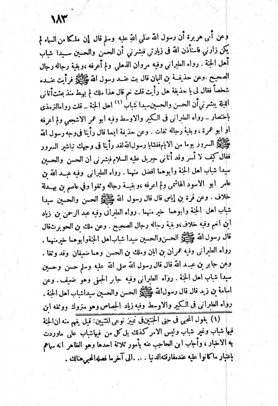 15086 - «وَعَنْ حُذَيْفَةَ بْنِ الْيَمَانِ قَالَ: بِتُّ عِنْدَ رَسُولِ اللَّهِ - صَلَّى اللَّهُ عَلَيْهِ وَسَلَّمَ - فَرَأَيْتُ عِنْدَهُ شَخْصًا، فَقَالَ لِي: " يَا حُذَيْفَةُ هَلْ رَأَيْتَ؟ ". قُلْتُ: نَعَمْ. قَالَ: " هَذَا مَلَكٌ لَمْ يَهْبِطْ مُنْذُ بُعِثْتُ، أَتَانِي اللَّيْلَةَ يُبَشِّرُنِي أَنَّ الْحَسَنَ وَالْحُسَيْنَ سَيِّدَا شَبَابِ أَهْلِ الْجَنَّةِ» ".