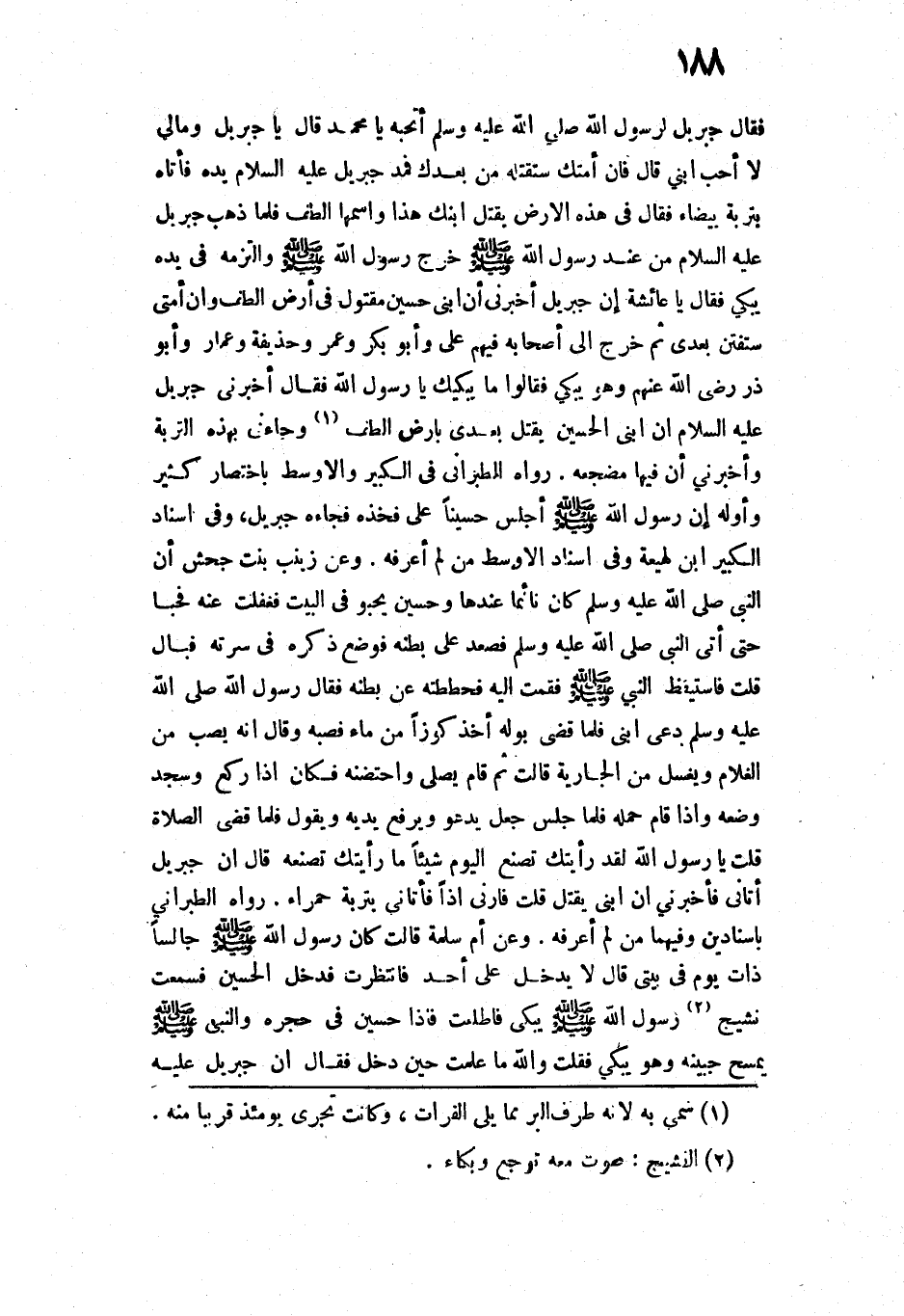فَقَالَ جِبْرِيلُ لِرَسُولِ اللَّهِ - صَلَّى اللَّهُ عَلَيْهِ وَسَلَّمَ -: أَتُحِبُّهُ يَا مُحَمَّدُ؟ قَالَ: " يَا جِبْرِيلُ، وَمَا لِي لَا أُحِبُّ ابْنِي! ". قَالَ: فَإِنَّ أُمَّتَكَ سَتَقْتُلُهُ مِنْ بَعْدِكَ، فَمَدَّ جِبْرِيلُ - عَلَيْهِ السَّلَامُ - يَدَهُ، فَأَتَاهُ بِتُرْبَةٍ بَيْضَاءَ، فَقَالَ: فِي هَذِهِ الْأَرْضِ يُقْتَلُ ابْنُكَ هَذَا، وَاسْمُهَا الطَّفُّ، فَلَمَّا ذَهَبَ جِبْرِيلُ مِنْ عِنْدِ رَسُولِ اللَّهِ - صَلَّى اللَّهُ عَلَيْهِ وَسَلَّمَ - خَرَجَ رَسُولُ اللَّهِ - صَلَّى اللَّهُ عَلَيْهِ وَسَلَّمَ - وَالْتَزَمَهُ فِي يَدِهِ يَبْكِي، فَقَالَ: " يَا عَائِشَةُ، إِنَّ جِبْرِيلَ أَخْبَرَنِي أَنَّ ابْنِي حُسَيْنًا مَقْتُولٌ فِي أَرْضِ الطَّفِّ، وَأَنَّ أُمَّتِي سَتُفْتَنُ بَعْدِي ". ثُمَّ خَرَجَ إِلَى أَصْحَابِهِ، فِيهِمْ عَلِيٌّ، وَأَبُو بَكْرٍ، وَعُمَرُ، وَحُذَيْفَةُ، وَعَمَّارٌ، وَأَبُو ذَرٍّ - رَضِيَ اللَّهُ عَنْهُمْ - وَهُوَ يَبْكِي، فَقَالُوا: مَا يُبْكِيكَ يَا رَسُولَ اللَّهِ؟ فَقَالَ: " أَخْبَرَنِي جِبْرِيلُ عَلَيْهِ السَّلَامُ: أَنَّ ابْنِي الْحُسَيْنَ يُقْتَلُ بَعْدِي بِأَرْضِ الطَّفِّ، وَجَاءَنِي بِهَذِهِ التُّرْبَةِ، وَأَخْبَرَنِي أَنَّ فِيهَا مَضْجَعَهُ» ".
