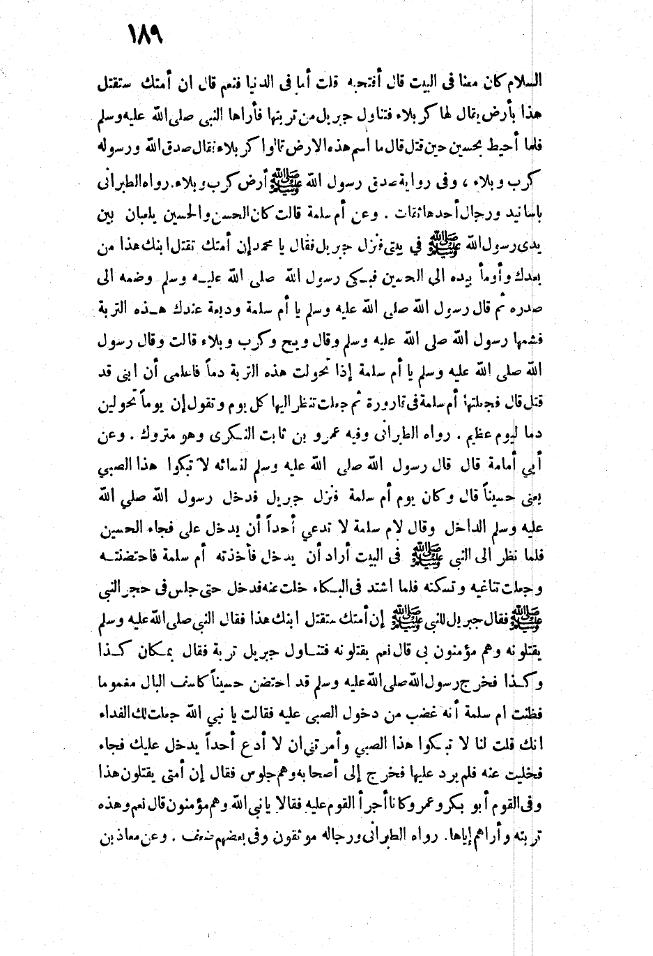 السَّلَامُ - كَانَ مَعَنَا فِي الْبَيْتِ، فَقَالَ: أَتُحِبُّهُ؟ قُلْتُ: أَمَّا فِي الدُّنْيَا فَنَعَمْ. قَالَ: إِنَّ أُمَّتَكَ سَتَقْتُلَ هَذَا بِأَرْضٍ يُقَالُ لَهَا: كَرْبَلَاءُ، فَتَنَاوَلَ جِبْرِيلُ مِنْ تُرْبَتِهَا ". فَأَرَاهَا النَّبِيَّ - صَلَّى اللَّهُ عَلَيْهِ وَسَلَّمَ - فَلَمَّا أُحِيطُ بِحُسَيْنٍ حِينَ قُتِلَ قَالَ: مَا اسْمُ هَذِهِ الْأَرْضِ؟ قَالُوا: كَرْبَلَاءُ، فَقَالَ: صَدَقَ اللَّهُ وَرَسُولُهُ ; كَرْبٌ وَبَلَاءٌ».