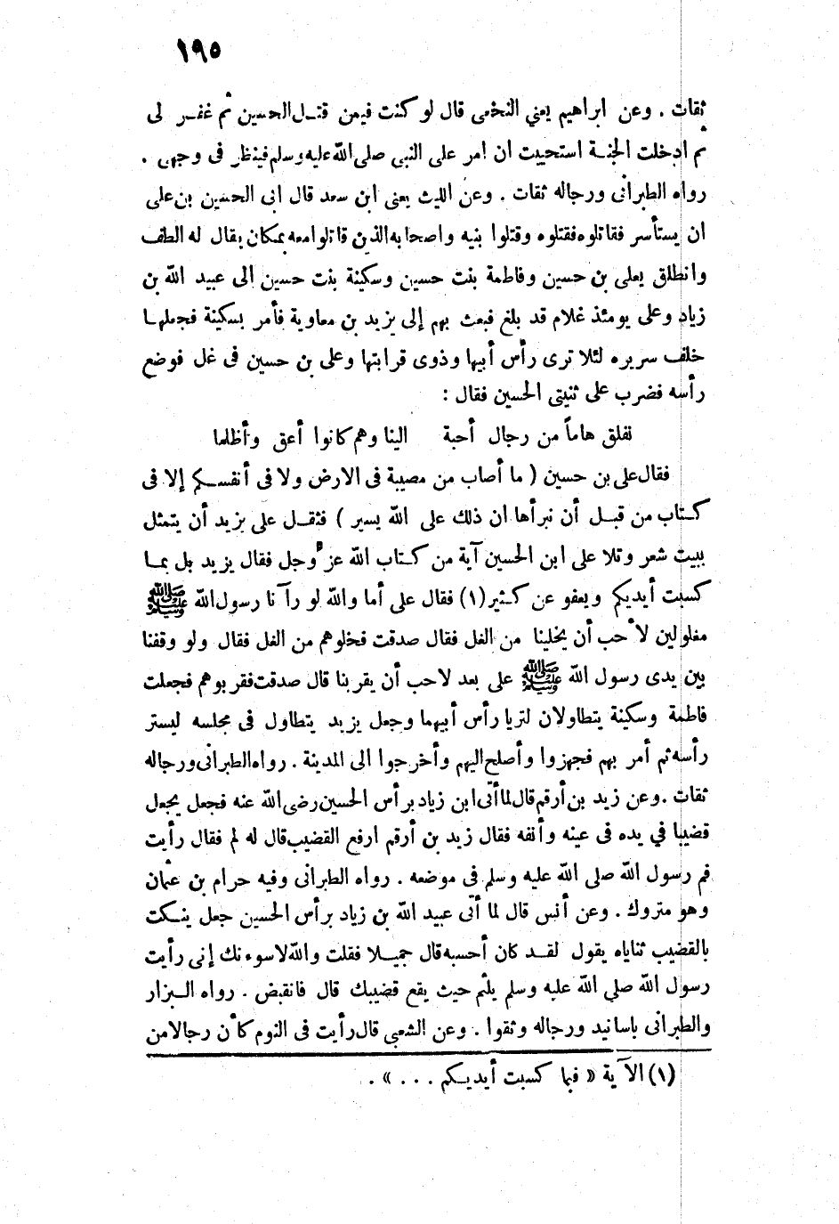 15149 - «وَعَنْ زَيْدِ بْنِ أَرْقَمَ قَالَ: لَمَّا أُتِيَ ابْنُ زِيَادٍ بِرَأْسِ الْحُسَيْنِ - رَضِيَ اللَّهُ عَنْهُ - فَجَعَلَ يَنْقُرُ بِقَضِيبٍ فِي يَدِهِ فِي عَيْنِهِ وَأَنْفِهِ، فَقَالَ زَيْدُ بْنُ أَرْقَمَ: ارْفَعِ الْقَضِيبَ قَالَ، لَهُ: لِمَ؟ فَقَالَ: رَأَيْتُ فَمَ رَسُولِ اللَّهِ - صَلَّى اللَّهُ عَلَيْهِ وَسَلَّمَ - فِي مَوْضِعِهِ».