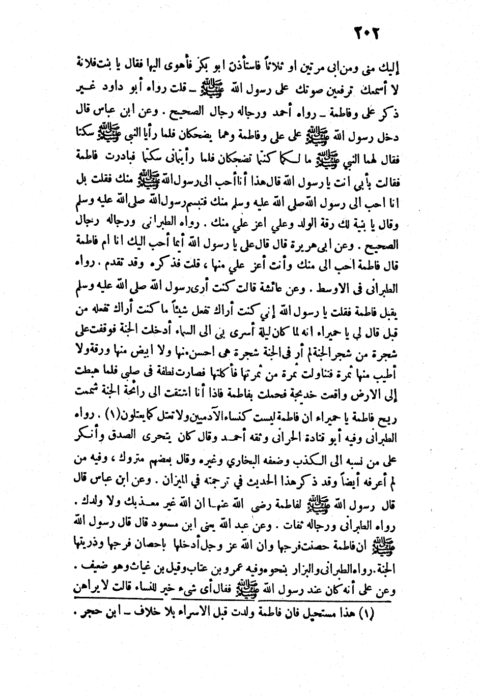 إِلَيْكَ مِنِّي وَمِنْ أَبِي - مَرَّتَيْنِ أَوْ ثَلَاثًا -. فَاسْتَأْذَنَ أَبُو بَكْرٍ، [فَدَخَلَ] فَأَهْوَى إِلَيْهَا، فَقَالَ: يَا بِنْتَ فُلَانَةَ، لَا أَسْمَعُكِ تَرْفَعِينَ صَوْتَكِ عَلَى رَسُولِ اللَّهِ - صَلَّى اللَّهُ عَلَيْهِ وَسَلَّمَ» -. قُلْتُ: رَوَاهُ أَبُو دَاوُدَ غَيْرَ ذِكْرِ عَلِيٍّ وَفَاطِمَةَ.