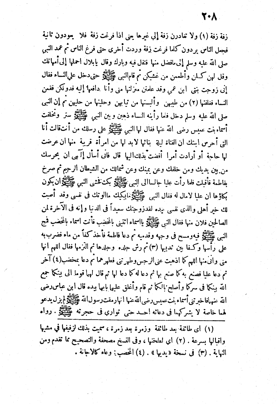 زَفَّةً زَفَّةً، وَلَا يُغَادِرْنَ زَفَّةً إِلَى غَيْرِهَا ". - يَعْنِي إِذَا فَرَغَتْ زَفَّةٌ فَلَا يَعُودُونَ ثَانِيَةً -. فَجَعَلَ النَّاسُ يَرِدُونَ، كُلَّمَا فَرَغَتْ زَفَّةٌ وَرَدَتْ أُخْرَى، حَتَّى فَرَغَ النَّاسُ. ثُمَّ عَمَدَ النَّبِيُّ - صَلَّى اللَّهُ عَلَيْهِ وَسَلَّمَ - إِلَى مَا فَضَلَ مِنْهَا، فَتَفَلَ فِيهِ وَبَارَكَ، وَقَالَ: " يَا بِلَالُ، احْمِلْهَا إِلَى أُمَّهَاتِكَ، وَقُلْ لَهُنَّ: كُلْنَ وَأَطْعِمْنَ مَنْ غَشِيَكُنَّ ". ثُمَّ قَامَ النَّبِيُّ - صَلَّى اللَّهُ عَلَيْهِ وَسَلَّمَ - حَتَّى دَخَلَ عَلَى النِّسَاءِ، فَقَالَ: " إِنِّي زَوَّجْتُ بِنْتِي ابْنَ عَمِّي، وَقَدْ عَلِمْتُنَّ مَنْزِلَتَهَا مِنِّي، وَأَنَا دَافِعُهَا إِلَيْهِ فَدُونَكُنَّ ". فَقُمْنَ النِّسَاءُ فَغَلَّفْنَهَا مِنْ طِيبِهِنَّ، وَأَلْبَسْنَهَا مِنْ ثِيَابِهِنَّ، وَحَلَّيْنَهَا مِنْ حُلِيِّهِنَّ، ثُمَّ إِنَّ النَّبِيَّ - صَلَّى اللَّهُ عَلَيْهِ وَسَلَّمَ - دَخَلَ، فَلَمَّا رَأَيْنَهُ النِّسَاءُ ذَهَبْنَ، وَبَيْنَ النَّبِيِّ - صَلَّى اللَّهُ عَلَيْهِ وَسَلَّمَ - سِتْرٌ، وَتَخَلَّفَتْ أَسْمَاءُ بِنْتُ عُمَيْسٍ - رَضِيَ اللَّهُ عَنْهَا - فَقَالَ لَهَا النَّبِيُّ - صَلَّى اللَّهُ عَلَيْهِ وَسَلَّمَ -: " عَلَى رِسْلِكِ، مَنْ أَنْتِ؟ ". قَالَتْ: أَنَا الَّتِي أَحْرُسُ ابْنَتَكَ، إِنَّ الْفَتَاةَ لَيْلَةَ بِنَائِهَا لَا بُدَّ لَهَا مِنِ امْرَأَةٍ [تَكُونُ] قَرِيبَةٍ مِنْهَا، إِنْ عَرَضَتْ لَهَا حَاجَةٌ أَوْ أَرَادَتْ أَمْرًا أَفْضَتْ بِذَلِكَ إِلَيْهَا. قَالَ: " فَإِنِّي أَسَالُ إِلَهِي أَنْ يَحْرُسَكِ مِنْ بَيْنِ يَدَيْكِ وَمِنْ خَلْفِكِ، وَعَنْ يَمِينِكِ وَعَنْ شِمَالِكِ، مِنَ الشَّيْطَانِ الرَّجِيمِ ". ثُمَّ صَرَخَ بِفَاطِمَةَ فَأَقْبَلَتْ، فَلَمَّا رَأَتْ عَلِيًّا جَالِسًا إِلَى النَّبِيِّ - صَلَّى اللَّهُ عَلَيْهِ وَسَلَّمَ -[حَصَرَتْ] بَكَتْ، فَخَشِيَ النَّبِيُّ - صَلَّى اللَّهُ عَلَيْهِ وَسَلَّمَ - أَنْ يَكُونَ بُكَاؤُهَا أَنَّ عَلِيًّا لَا مَالَ لَهُ، فَقَالَ النَّبِيُّ - صَلَّى اللَّهُ عَلَيْهِ وَسَلَّمَ -: " مَا يُبْكِيكِ؟ مَا أَلَوْتُكِ فِي نَفْسِي، وَقَدْ أَصَبْتُ لَكِ خَيْرَ أَهْلِي، وَالَّذِي نَفْسِي بِيَدِهِ لَقَدْ زَوَّجْتُكِ سَعِيدًا فِي الدُّنْيَا، وَإِنَّهُ فِي الْآخِرَةِ لِمَنِ الصَّالِحِينَ ". فَلَانَ مِنْهَا. فَقَالَ النَّبِيُّ - صَلَّى اللَّهُ عَلَيْهِ وَسَلَّمَ -: " يَا أَسْمَاءُ، ائْتِينِي بِالْمِخْضَبِ [فَامْلَئِيهِ مَاءً] ". فَأَتَتْ أَسْمَاءُ بِالْمِخْضَبِ، فَمَجَّ النَّبِيُّ - صَلَّى اللَّهُ عَلَيْهِ وَسَلَّمَ - فِيهِ، وَمَسَحَ فِي وَجْهِهِ وَقَدَمَيْهِ، ثُمَّ دَعَا فَاطِمَةَ، فَأَخَذَ كَفًّا مِنْ مَاءٍ فَضَرَبَ بِهِ عَلَى رَأْسِهَا، وَكَفًّا بَيْنَ ثَدْيَيْهَا، ثُمَّ رَشَّ جِلْدَهُ وَجِلْدَهَا، ثُمَّ الْتَزَمَهَا، فَقَالَ: " اللَّهُمَّ إِنَّهَا مِنِّي وَإِنِّي مِنْهَا، اللَّهُمَّ كَمَا أَذْهَبْتَ عَنِّي الرِّجْسَ وَطَهَّرْتَنِي فَطَهِّرْهُمَا ". ثُمَّ دَعَا بِمِخْضَبٍ آخَرَ، ثُمَّ دَعَا عَلِيًّا، فَصَنَعَ بِهِ كَمَا صَنَعَ بِهَا، ثُمَّ دَعَا لَهُ كَمَا دَعَا لَهَا، ثُمَّ قَالَ لَهُمَا: " قُومَا إِلَى بَيْتِكُمَا، جَمَعَ اللَّهُ بَيْنَكُمَا [وَبَارَكَ] فِي سِرِّكُمَا، وَأَصْلَحَ بَالَكُمَا ". ثُمَّ قَامَ وَأَغْلَقَ عَلَيْهِمَا بَابَهُمَا بِيَدِهِ.