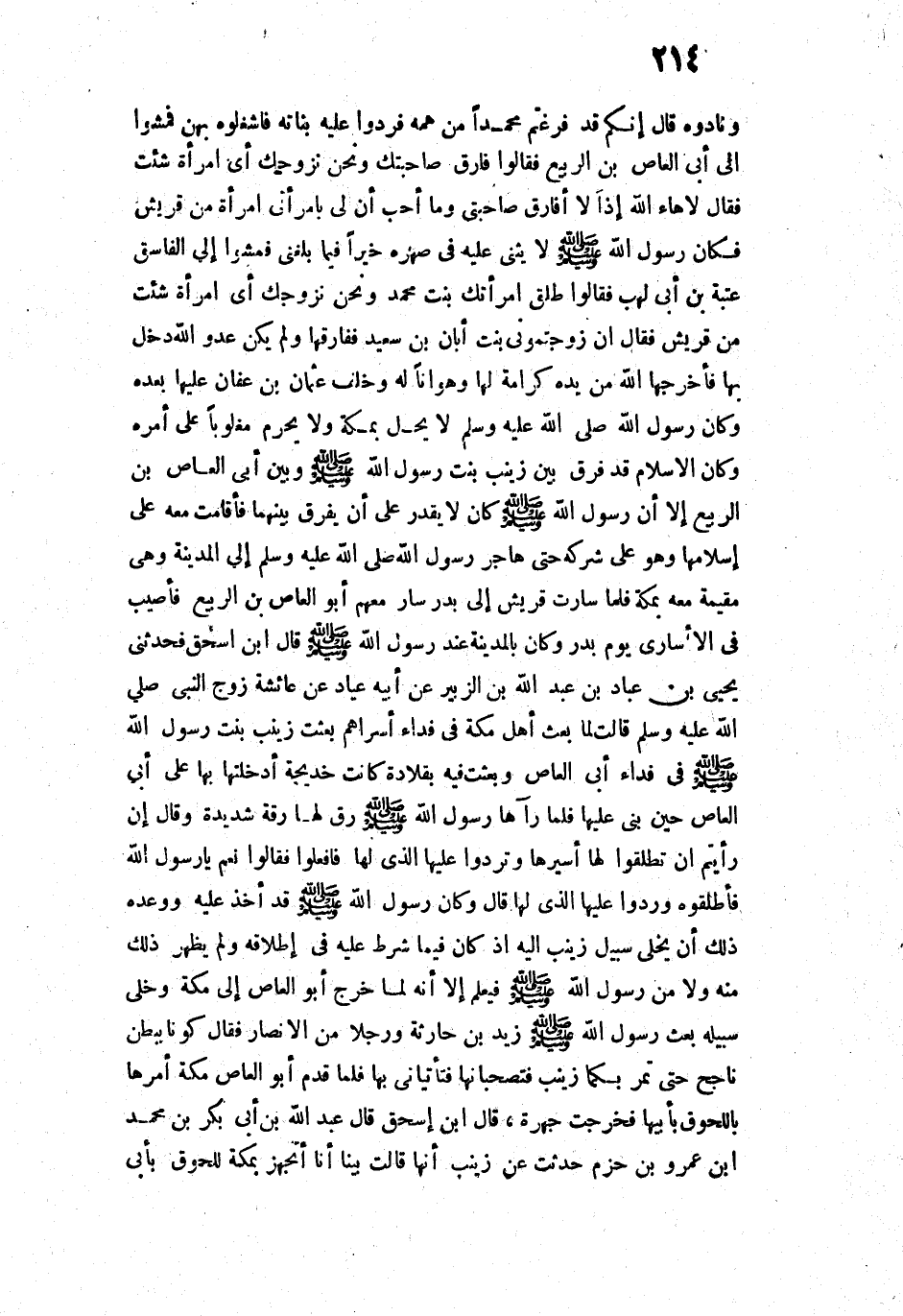 وَبَادَوْهُ، قَالَ: " إِنَّكُمْ قَدْ فَرَّغْتُمْ مُحَمَّدًا مِنْ هَمِّهِ، فَرَدُّوا عَلَيْهِ بَنَاتِهِ فَاشْغَلُوهُ بِهِنَّ ". فَمَشَوْا إِلَى أَبِي الْعَاصِ بْنِ الرَّبِيعِ، فَقَالُوا: فَارِقْ صَاحِبَتَكَ، وَنَحْنُ نُزَوِّجُكَ أَيَّ امْرَأَةٍ شِئْتَ. فَقَالَ: لَا هَاءَ اللَّهِ، إِذًا لَا أُفَارِقُ صَاحِبَتِي، وَمَا أُحِبُّ أَنَّ لِي بِامْرَأَتِي امْرَأَةً مِنْ قُرَيْشٍ. فَكَانَ رَسُولُ اللَّهِ - صَلَّى اللَّهُ عَلَيْهِ وَسَلَّمَ - يُثْنِي عَلَيْهِ فِي صِهْرِهِ خَيْرًا - فِيمَا بَلَغَنِي -. فَمَشَوْا إِلَى الْفَاسِقِ عُتْبَةَ بْنِ أَبِي لَهَبٍ، فَقَالُوا: طَلِّقِ امْرَأَتَكَ بِنْتَ مُحَمَّدٍ، وَنَحْنُ نُزَوِّجُكَ أَيَّ امْرَأَةٍ مِنْ قُرَيْشٍ، فَقَالَ: إِنْ زَوَّجْتُمُونِي بِنْتَ أَبَانَ بْنِ سَعِيدِ بْنِ الْعَاصِ [أَوْ بِنْتَ سَعِيدِ بْنِ الْعَاصِ فَارَقْتُهَا] فَزَوَّجَهُ بِنْتَ سَعِيدِ [بْنِ الْعَاصِ]. فَفَارَقَهَا، وَلَمْ يَكُنْ عَدُوُّ اللَّهِ دَخَلَ بِهَا، فَأَخْرَجَهَا اللَّهُ مِنْ يَدِهِ ; كَرَامَةً لَهَا وَهَوَانًا لَهُ، وَخَلَفَ عُثْمَانَ بْنَ عَفَّانَ عَلَيْهَا بَعْدَهُ، وَكَانَ رَسُولُ اللَّهِ - صَلَّى اللَّهُ عَلَيْهِ وَسَلَّمَ - لَا يَحِلُّ بِمَكَّةَ وَلَا يُحْرِمُ مَغْلُوبًا عَلَى أَمْرِهِ، وَكَانَ الْإِسْلَامُ قَدْ فَرَّقَ بَيْنَ زَيْنَبَ بِنْتِ رَسُولِ اللَّهِ - صَلَّى اللَّهُ عَلَيْهِ وَسَلَّمَ - وَبَيْنَ أَبِي الْعَاصِ بْنِ الرَّبِيعِ، إِلَّا أَنَّ رَسُولَ اللَّهِ - صَلَّى اللَّهُ عَلَيْهِ وَسَلَّمَ - كَانَ لَا يَقْدِرُ عَلَى أَنْ يُفَرِّقَ بَيْنَهُمَا، فَأَقَامَتْ مَعَهُ عَلَى إِسْلَامِهَا وَهُوَ عَلَى شِرْكِهِ، حَتَّى هَاجَرَ رَسُولُ اللَّهِ - صَلَّى اللَّهُ عَلَيْهِ وَسَلَّمَ - إِلَى الْمَدِينَةِ، وَهِيَ مُقِيمَةٌ مَعَهُ بِمَكَّةَ، فَلَمَّا سَارَتْ قُرَيْشٌ إِلَى بَدْرٍ سَارَ مَعَهُمْ أَبُو الْعَاصِ بْنُ الرَّبِيعِ، فَأُصِيبَ فِي الْأُسَارَى يَوْمَ بَدْرٍ، وَكَانَ بِالْمَدِينَةِ عِنْدَ رَسُولِ اللَّهِ - صَلَّى اللَّهُ عَلَيْهِ وَسَلَّمَ» -.
