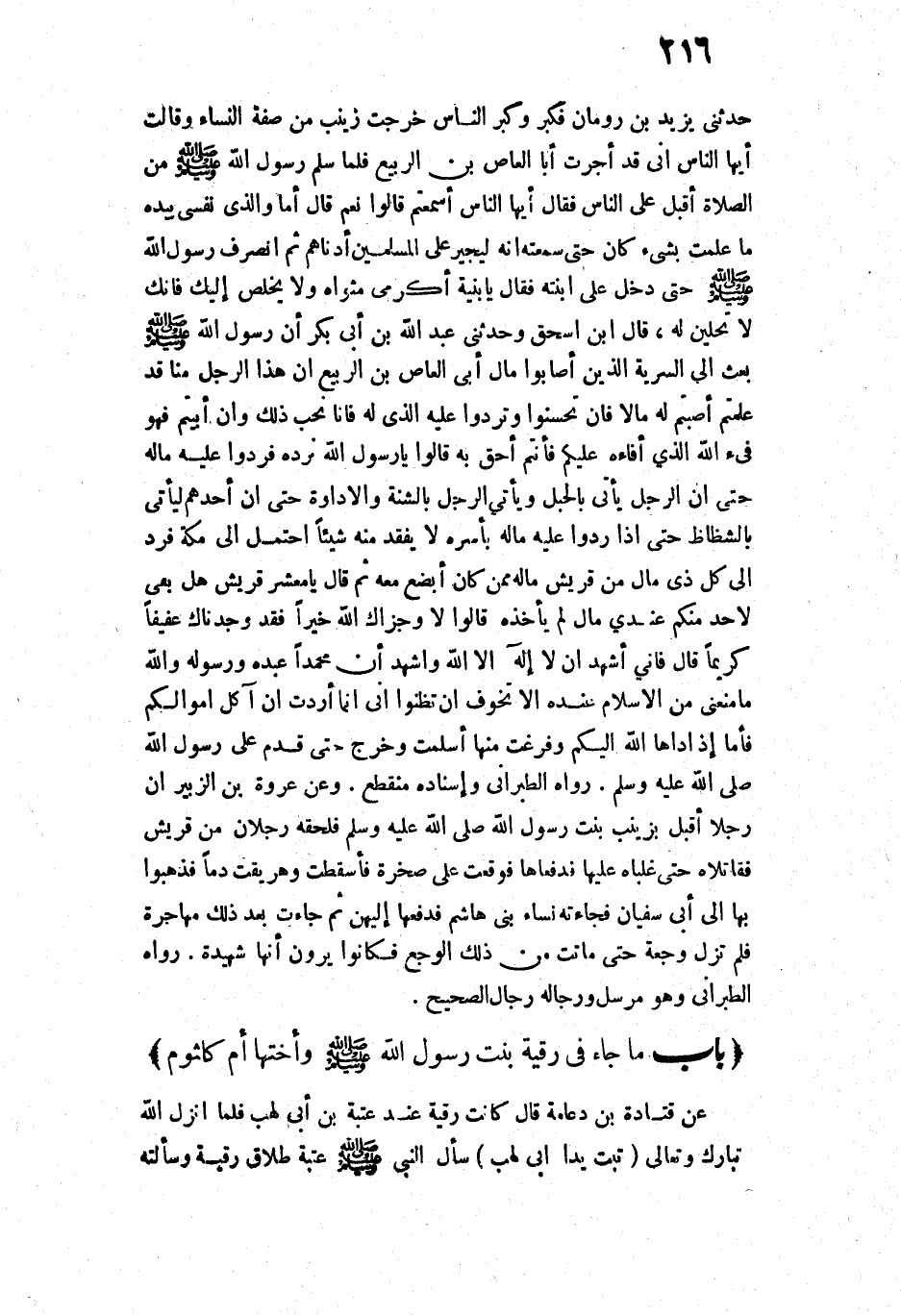 حَدَّثَنِي يَزِيدُ بْنُ رُومَانَ - فَكَبَّرَ وَكَبَّرَ النَّاسُ، خَرَجَتْ زَيْنَبُ مِنْ صُفَّةِ النِّسَاءِ، وَقَالَتْ: أَيُّهَا النَّاسُ، إِنِّي قَدْ أَجَرْتُ أَبَا الْعَاصِ بْنَ الرَّبِيعِ. فَلَمَّا سَلَّمَ رَسُولُ اللَّهِ - صَلَّى اللَّهُ عَلَيْهِ وَسَلَّمَ - مِنَ الصَّلَاةِ، أَقْبَلَ عَلَى النَّاسِ، فَقَالَ: " أَيُّهَا النَّاسُ، أَسْمِعْتُمْ؟ ". قَالُوا: نَعَمْ. قَالَ: " أَمَا وَالَّذِي نَفْسِي بِيَدِهِ مَا عَلِمْتُ بِشَيْءٍ كَانَ حَتَّى سَمِعْتُهُ، إِنَّهُ لَيُجِيرُ عَلَى الْمُسْلِمِينَ أَدْنَاهُمْ ". ثُمَّ انْصَرَفَ رَسُولُ اللَّهِ - صَلَّى اللَّهُ عَلَيْهِ وَسَلَّمَ - حَتَّى دَخَلَ عَلَى ابْنَتِهِ، فَقَالَ: " يَا بُنَيَّةُ، أَكْرِمِي مَثْوَاهُ، وَلَا يَخْلُصُ إِلَيْكِ، فَإِنَّكِ لَا تَحِلِّينَ لَهُ» ".