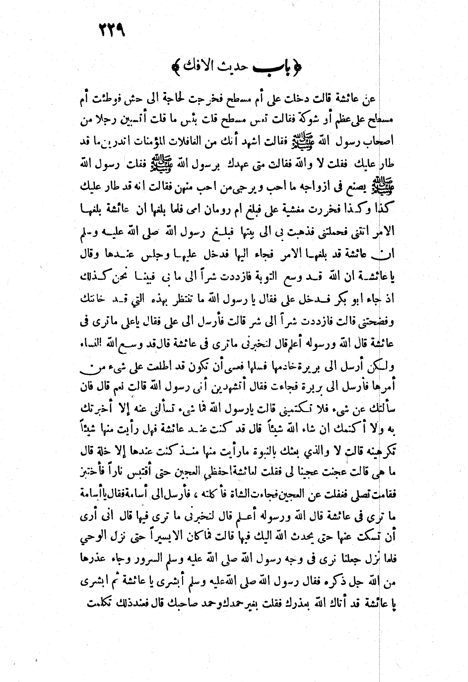 15295 - عَنْ عَائِشَةَ قَالَتْ: «دَخَلَتْ عَلَيَّ أُمُّ مِسْطَحٍ، فَخَرَجْتُ لِحَاجَةٍ لِي إِلَى حُشٍّ، فَوَطِئَتْ أُمُّ مِسْطَحٍ عَلَى عَظْمٍ أَوْ شَوْكَةٍ، فَقَالَتْ: تَعِسَ مِسْطَحٌ، قُلْتُ: بِئْسَ مَا قُلْتِ تَسُبِّينَ رَجُلًا مِنْ أَصْحَابِ رَسُولِ اللَّهِ - صَلَّى اللَّهُ عَلَيْهِ وَسَلَّمَ - فَقَالَتْ: أَشْهَدُ أَنَّكِ مِنَ الْغَافِلَاتِ الْمُؤْمِنَاتِ، أَتَدْرِينَ مَا قَدْ طَارَ عَلَيْكِ؟ فَقُلْتُ: لَا وَاللَّهِ، فَقَالَتْ: مَتَى عَهْدُكِ بِرَسُولِ اللَّهِ - صَلَّى اللَّهُ عَلَيْهِ وَسَلَّمَ -؟ فَقُلْتُ: رَسُولُ اللَّهِ - صَلَّى اللَّهُ عَلَيْهِ وَسَلَّمَ - يَصْنَعُ فِي أَزْوَاجِهِ مَا أَحَبَّ، وَيُرْجِي مَنْ أَحَبَّ مِنْهُنَّ؟ قَالَتْ: إِنَّهُ طَارَ عَلَيْكِ كَذَا وَكَذَا، فَخَرَرْتُ مَغْشِيَّةً عَلَيَّ، فَبَلَغَ أُمَّ رُومَانَ أُمِّي، فَلَمَّا بَلَغَهَا أَنَّ عَائِشَةَ بَلَغَهَا الْأَمْرُ، أَتَتْنِي فَحَمَلَتْنِي، فَذَهَبَتْ بِي إِلَى بَيْتِهَا، فَبَلَغَ رَسُولُ اللَّهِ - صَلَّى اللَّهُ عَلَيْهِ وَسَلَّمَ - أَنَّ عَائِشَةَ قَدْ بَلَغَهَا الْخَبَرُ، فَجَاءَ إِلَيْهَا، فَدَخَلَ عَلَيْهَا وَجَلَسَ عِنْدَهَا، وَقَالَ: " يَا عَائِشَةُ، إِنَّ اللَّهَ قَدْ وَسَّعَ التَّوْبَةَ ". فَازْدَدْتُ شَرًّا إِلَى مَا بِي، فَبَيْنَا نَحْنُ كَذَلِكَ إِذْ جَاءَ أَبُو بَكْرٍ، فَدَخَلَ عَلَيَّ، فَقَالَ: يَا رَسُولَ اللَّهِ، مَا تَنْظُرَنَّ بِهَذِهِ الَّتِي قَدْ خَانَتْكَ وَفَضَحَتْنِي؟ قَالَتْ: فَازْدَدْتُ شَرًّا إِلَى شَرٍّ. قَالَتْ: فَأَرْسَلَ إِلَى عَلِيٍّ، فَقَالَ: " يَا عَلِيُّ مَا تَرَى فِي عَائِشَةَ؟ ". قَالَ: اللَّهُ وَرَسُولُهُ أَعْلَمُ. قَالَ: " لَتُخْبِرَنِّي مَا تَرَى فِي عَائِشَةَ؟ ". قَالَ: قَدْ وَسَّعَ اللَّهُ النِّسَاءَ، وَلَكِنْ أَرْسِلْ إِلَى بَرِيرَةَ خَادِمِهَا فَسَلْهَا، فَعَسَى أَنْ تَكُونَ قَدِ اطَّلَعَتْ عَلَى شَيْءٍ مِنْ أَمْرِهَا، فَأَرْسَلَ إِلَى بَرِيرَةَ، فَجَاءَتْ، فَقَالَ: " أَتَشْهَدِينَ أَنِّي رَسُولُ اللَّهِ؟ ". قَالَتْ: نَعَمْ. قَالَ: " فَإِنْ سَأَلْتُكِ عَنْ شَيْءٍ فَلَا تَكْتُمِينِي ". قَالَتْ: يَا رَسُولَ اللَّهِ، فَمَا شَيْءٌ تَسْأَلُنِي عَنْهُ إِلَّا أَخْبَرْتُكَ بِهِ، وَلَا أَكْتُمُكَ إِنْ شَاءَ اللَّهُ شَيْئًا. قَالَ: " قَدْ كُنْتِ عِنْدَ عَائِشَةَ، فَهَلْ رَأَيْتِ مِنْهَا شَيْئًا تَكْرَهِينَهُ ". قَالَتْ: لَا وَالَّذِي بَعَثَكَ بِالنُّبُوَّةِ ; مَا رَأَيْتُ مِنْهَا مُنْذُ كُنْتُ عِنْدَهَا إِلَّا خَلَّةً. قَالَ: " مَا هِيَ؟ ". قَالَتْ: عَجَنْتُ عَجِينًا لِي، فَقُلْتُ لِعَائِشَةَ: احْفَظِي الْعَجِينَ حَتَّى أَقْتَبِسَ نَارًا فَأَخْتَبِزَ، فَقَامَتْ تُصَلِّي فَغَفَلَتْ عَنِ الْعَجِينِ، فَجَاءَتِ الشَّاةُ فَأَكَلَتْهُ. فَأَرْسَلَ إِلَى أُسَامَةَ، فَقَالَ: " يَا أُسَامَةُ، مَا تَرَى فِي عَائِشَةَ؟ ". قَالَ: اللَّهُ وَرَسُولُهُ أَعْلَمُ. قَالَ: " لَتُخْبِرَنِّي مَا تَرَى فِيهَا؟ ". قَالَ: إِنِّي أَرَى أَنْ تَسْكُتَ عَنْهَا حَتَّى يُحْدِثَ اللَّهُ إِلَيْكَ فِيهَا. قَالَتْ: فَمَا كَانَ إِلَّا يَسِيرًا حَتَّى نَزَلَ الْوَحْيُ، فَلَمَّا نَزَلَ جَعَلْنَا نَرَى فِي وَجْهِ رَسُولِ اللَّهِ - صَلَّى اللَّهُ عَلَيْهِ وَسَلَّمَ -: " أَبْشِرِي يَا عَائِشَةُ، ثُمَّ أَبْشِرِي يَا عَائِشَةُ ; قَدْ أَتَاكِ اللَّهُ بِعُذْرِكِ ". فَقُلْتُ: بِغَيْرِ حَمْدِكَ وَحَمْدِ صَاحِبِكَ. قَالَ: فَعِنْدَ ذَلِكَ تَكَلَّمْتُ».