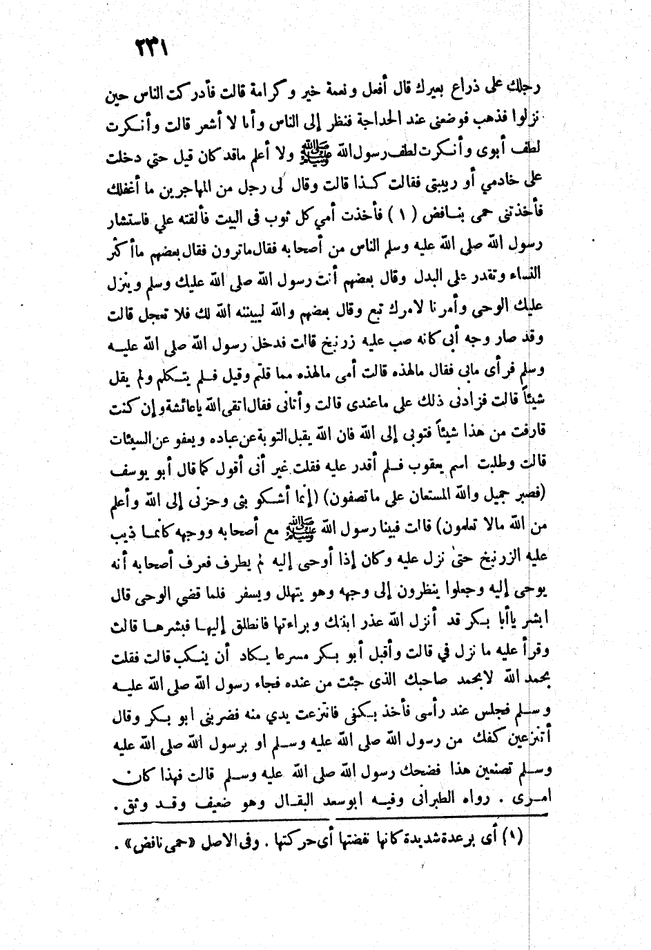 رِجْلَكَ عَلَى ذِرَاعِ بَعِيرِكَ. قَالَ: أَفْعَلُ وَنِعْمَةُ عَيْنٍ وَكَرَامَةٌ. قَالَتْ: فَأَدْرَكْتُ النَّاسَ حِينَ نَزَلُوا، فَذَهَبَ فَوَضَعَنِي عِنْدَ الْحِدَاجَةِ، فَنَظَرَ إِلَيَّ النَّاسُ وَأَنَا لَا أَشْعُرُ، قَالَتْ: وَأَنْكَرْتُ لُطْفَ أَبَوَيَّ، وَأَنْكَرْتُ لُطْفَ رَسُولِ اللَّهِ - صَلَّى اللَّهُ عَلَيْهِ وَسَلَّمَ - وَلَا أَعْلَمُ مَا قَدْ كَانَ قِيلَ، حَتَّى دَخَلَتْ عَلَيَّ خَادِمِي أَوْ رَبِيبَتِي، فَقَالَتْ كَذَا قَالَتْ، وَقَالَ لِي رَجُلٌ مِنَ الْمُهَاجِرِينَ: مَا أَغْفَلَكِ! فَأَخَذَتْنِي حُمَّى نَافِضٍ، فَأَخَذَتْ أُمِّي كُلَّ ثَوْبٍ كَانَ فِي الْبَيْتِ فَأَلْقَتْهُ عَلَيَّ. فَاسْتَشَارَ رَسُولُ اللَّهِ - صَلَّى اللَّهُ عَلَيْهِ وَسَلَّمَ - النَّاسَ مِنْ أَصْحَابِهِ، فَقَالَ: " مَا تَرَوْنَ؟ ". فَقَالَ بَعْضُهُمْ: مَا أَكْثَرَ النِّسَاءَ، وَتَقْدِرُ عَلَى الْبَدَلِ. وَقَالَ بَعْضُهُمْ: أَنْتَ رَسُولُ اللَّهِ - صَلَّى اللَّهُ عَلَيْهِ وَسَلَّمَ - وَيَنْزِلُ عَلَيْكَ الْوَحْيُ، وَأَمْرُنَا لِأَمْرِكَ تَبَعٌ. وَقَالَ بَعْضُهُمْ: وَاللَّهِ لَيُبَيِّنَنَّهُ اللَّهُ لَكَ فَلَا تَعْجَلْ.
