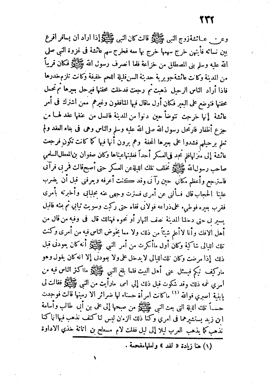 وَكَانَ صَفْوَانُ بْنُ الْمُعَطَّلِ السُّلَمِيُّ - صَاحِبُ رَسُولِ اللَّهِ - صَلَّى اللَّهُ عَلَيْهِ وَسَلَّمَ - تَخَلَّفَ تِلْكَ اللَّيْلَةَ عَنِ الْعَسْكَرِ حَتَّى أَصْبَحَ. قَالَتْ: فَمَرَّ بِي فَرَآنِي فَاسْتَرْجَعَ، وَأَعْظَمَ مَكَانِي حِينَ رَآنِي وَحْدِي، وَقَدْ كُنْتُ أَعْرِفُهُ وَيَعْرِفُنِي قَبْلَ أَنْ يُضْرَبَ عَلَيْنَا الْحِجَابُ. قَالَتْ: فَسَأَلَنِي عَنْ أَمْرِي، فَسَتَرْتُ وَجْهِي عَنْهُ بِجِلْبَابِي، وَأَخْبَرْتُهُ بِأَمْرِي، فَقَرَّبَ بَعِيرَهُ فَوَطِئَ عَلَى ذِرَاعِهِ، فَوَلَّانِي قَفَاهُ حَتَّى رَكِبْتُ، وَسَوَّيْتُ ثِيَابِي، ثُمَّ بَعَثَهُ، فَأَقْبَلَ يَسِيرُ بِي حَتَّى دَخَلْنَا الْمَدِينَةَ نِصْفَ النَّهَارِ أَوْ نَحْوَهُ، فَهُنَالِكَ قَالَ فِيَّ وَفِيهِ مَنْ قَالَ مِنْ أَهْلِ الْإِفْكِ، وَأَنَا لَا أَعْلَمُ شَيْئًا مِنْ ذَلِكَ، وَلَا مِمَّا يَخُوضُ النَّاسُ فِيهِ مِنْ أَمْرِي، وَكُنْتُ تِلْكَ اللَّيَالِي شَاكِيَةً. وَكَانَ أَوَّلُ مَا أَنْكَرْتُ مِنْ أَمْرِ النَّبِيِّ - صَلَّى اللَّهُ عَلَيْهِ وَسَلَّمَ - أَنَّهُ كَانَ يَعُودُنِي قَبْلَ ذَلِكَ إِذَا مَرِضْتُ، وَكَانَ تِلْكَ اللَّيَالِي لَا يُدْخُلُ عَلَيَّ وَلَا يَعُودُنِي، إِلَّا أَنَّهُ كَانَ يَقُولُ، وَهُوَ مَارٌّ: " كَيْفَ تِيكُمْ؟ ". فَيَسْأَلُ عَنِّي أَهْلَ الْبَيْتِ. فَلَمَّا بَلَغَ النَّبِيَّ - صَلَّى اللَّهُ عَلَيْهِ وَسَلَّمَ - مَا أَكْثَرَ النَّاسُ فِيهِ مِنْ أَمْرِي غَمَّهُ ذَلِكَ، وَقَدْ شَكَوْتُ قَبْلَ ذَلِكَ إِلَى أُمِّي مَا رَأَيْتُ مِنَ النَّبِيِّ - صَلَّى اللَّهُ عَلَيْهِ وَسَلَّمَ - مِنَ الْجَفْوَةِ فَقَالَتْ لِي: يَا بُنَيَّةُ، اصْبِرِي فَوَاللَّهِ لَقَلَّ مَا كَانَتِ امْرَأَةٌ حَسْنَاءُ يُحِبُّهَا زَوْجُهَا لَهَا ضَرَائِرُ إِلَّا رَمَيْنَهَا. قَالَتْ: فَوَجَدْتُ حِسًّا تِلْكَ اللَّيْلَةَ الَّتِي بَعَثَ النَّبِيُّ - صَلَّى اللَّهُ عَلَيْهِ وَسَلَّمَ - مِنْ صُبْحِهَا إِلَى عَلِيِّ بْنِ أَبِي طَالِبٍ، وَأُسَامَةَ بْنِ زَيْدٍ، يَسْتَشِيرُهُمَا فِي أَمْرِي، وَكُنَّا ذَلِكَ الزَّمَانَ لَيْسَ لَنَا كُنُفٌ نَذْهَبُ فِيهَا، إِنَّمَا كُنَّا نَذْهَبُ كَمَا يَذْهَبُ الْعَرَبُ لَيْلًا إِلَى لَيْلٍ، فَقُلْتُ لِأُمِّ مِسْطَحِ بْنِ أُثَاثَةَ: خُذِي الْإِدَاوَةَ