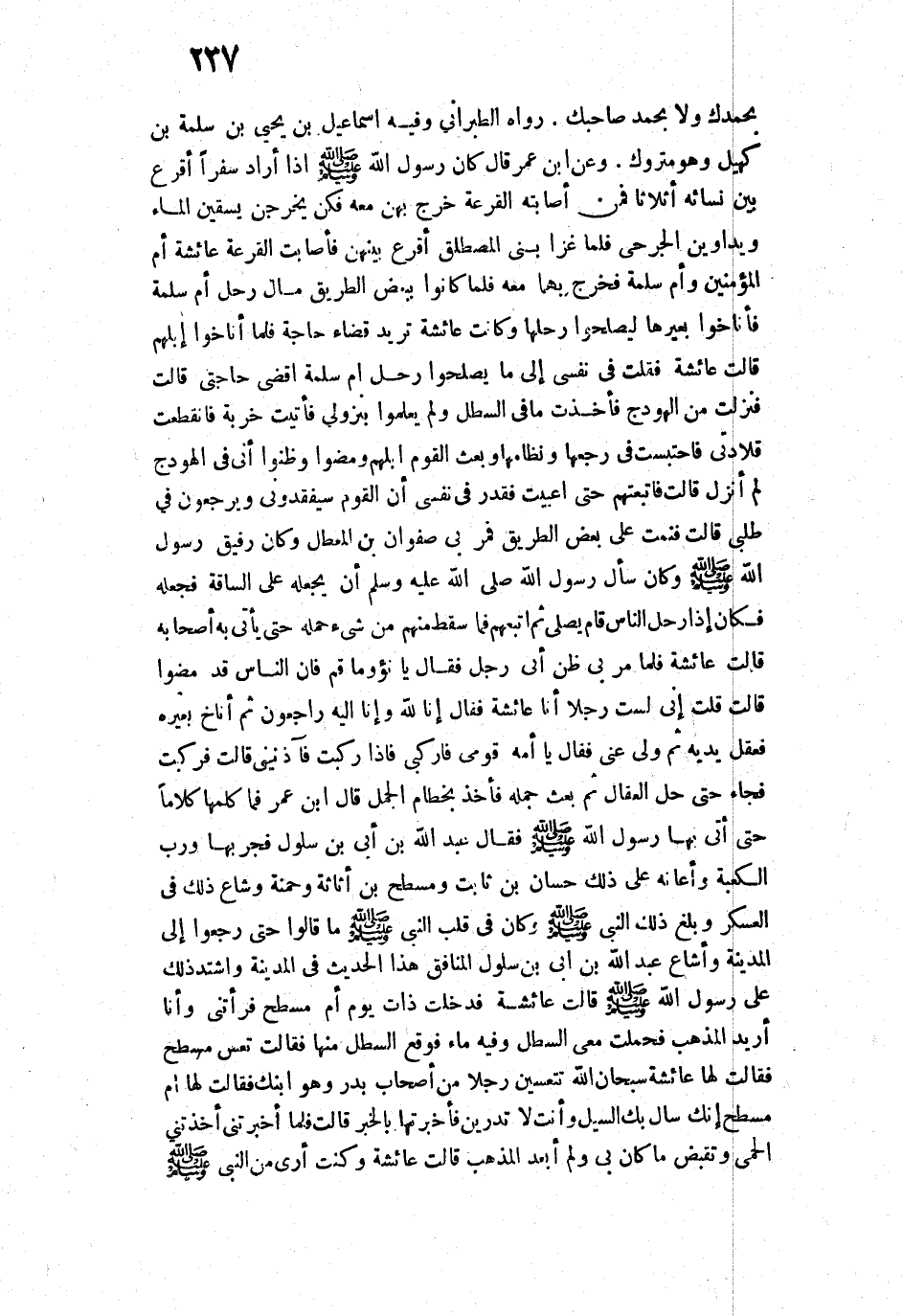 قَالَتْ عَائِشَةُ: فَدَخَلَتْ ذَاتَ يَوْمٍ أُمُّ مِسْطَحٍ، فَرَأَتْنِي وَأَنَا أُرِيدُ الْمَذْهَبَ، فَحَمَلَتْ مَعِيَ السَّطْلَ وَفِيهِ مَاءٌ، فَوَقَعَ السَّطْلُ مِنْهَا، فَقَالَتْ: تَعِسَ مِسْطَحٌ، فَقَالَتْ لَهَا عَائِشَةُ: سُبْحَانَ اللَّهِ! تُتَعِّسِينَ رَجُلًا مِنْ أَصْحَابِ بَدْرٍ، وَهُوَ ابْنُكِ؟! فَقَالَتْ لَهَا أُمُّ مِسْطَحٍ: إِنَّكِ سَالَ بِكِ السَّيْلُ وَأَنْتِ لَا تَدْرِينَ، فَأَخْبَرَتْهَا بِالْخَبَرِ.