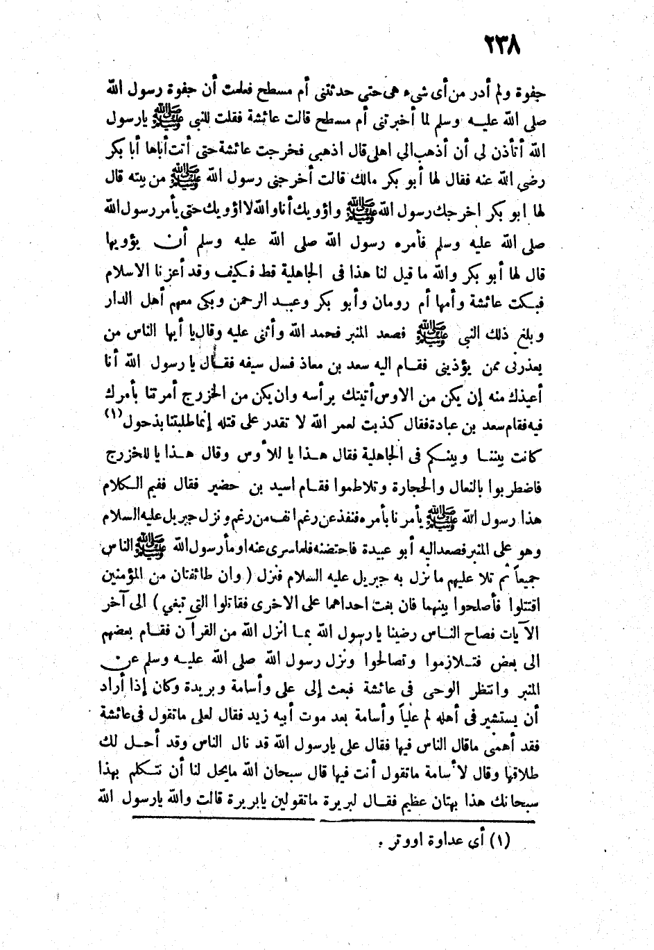 قَالَتْ عَائِشَةُ: فَقُلْتُ لِلنَّبِيِّ - صَلَّى اللَّهُ عَلَيْهِ وَسَلَّمَ -: يَا رَسُولَ اللَّهِ، أَتَأْذَنُ لِي أَنْ أَذْهَبَ إِلَى أَهْلِي؟ قَالَ: " اذْهَبِي ". فَخَرَجَتْ عَائِشَةُ حَتَّى أَتَتْ أَبَاهَا أَبَا بَكْرٍ - رَضِيَ اللَّهُ عَنْهُ - فَقَالَ لَهَا أَبُو بَكْرٍ: مَا لَكِ؟ قَالَتْ: أَخْرَجَنِي رَسُولُ اللَّهِ - صَلَّى اللَّهُ عَلَيْهِ وَسَلَّمَ - مِنْ بَيْتِهِ. قَالَ لَهَا أَبُو بَكْرٍ: أَخْرَجَكِ رَسُولُ اللَّهِ - صَلَّى اللَّهُ عَلَيْهِ وَسَلَّمَ - وَأُؤْوِيكِ أَنَا؟ وَاللَّهِ لَا أُؤْوِيكِ حَتَّى يَأْمُرَ رَسُولُ اللَّهِ - صَلَّى اللَّهُ عَلَيْهِ وَسَلَّمَ - فَأَمَرَهُ رَسُولُ اللَّهِ - صَلَّى اللَّهُ عَلَيْهِ وَسَلَّمَ - أَنْ يُؤْوِيَهَا. قَالَ لَهَا أَبُو بَكْرٍ: وَاللَّهِ مَا قِيلَ لَنَا هَذَا فِي الْجَاهِلِيَّةِ قَطُّ، فَكَيْفَ وَقَدْ أَعَزَّنَا الْإِسْلَامُ؟ فَبَكَتْ عَائِشَةُ وَأُمُّهَا أُمُّ رُومَانَ، وَأَبُو بَكْرٍ، وَعَبْدُ الرَّحْمَنِ، وَبَكَى مَعَهُمْ أَهْلُ الدَّارِ.
