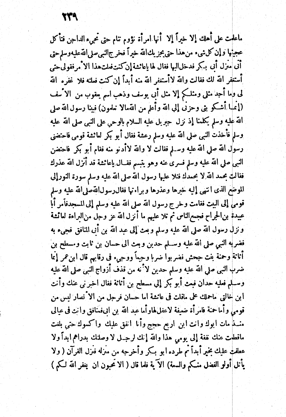 فَبَيْنَا رَسُولُ اللَّهِ - صَلَّى اللَّهُ عَلَيْهِ وَسَلَّمَ - يُكَلِّمُنَا إِذْ نَزَلَ جِبْرِيلُ - عَلَيْهِ السَّلَامُ - بِالْوَحْيِ عَلَى النَّبِيِّ - صَلَّى اللَّهُ عَلَيْهِ وَسَلَّمَ - فَأَخَذَتِ النَّبِيَّ - صَلَّى اللَّهُ عَلَيْهِ وَسَلَّمَ - رَعْشَةٌ، فَقَالَ أَبُو بَكْرٍ لِعَائِشَةَ: قُومِي فَاحْتَضِنِي رَسُولَ اللَّهِ - صَلَّى اللَّهُ عَلَيْهِ وَسَلَّمَ -. فَقَالَتْ: لَا وَاللَّهِ لَا أَدْنُو مِنْهُ. فَقَامَ أَبُو بَكْرٍ فَاحْتَضَنَ النَّبِيَّ - صَلَّى اللَّهُ عَلَيْهِ وَسَلَّمَ - فَسُرِّيَ عَنْهُ وَهُوَ يَبْتَسِمُ، فَقَالَ: " يَا عَائِشَةُ، قَدْ أَنْزَلَ اللَّهُ عُذْرَكِ ". فَقَالَتْ: بِحَمْدِ اللَّهِ لَا بِحَمْدِكَ. فَتَلَا عَلَيْهَا رَسُولُ اللَّهِ - صَلَّى اللَّهُ عَلَيْهِ وَسَلَّمَ - سُورَةَ النُّورِ إِلَى الْمَوْضِعِ الَّذِي انْتَهَى إِلَيْهِ خَبَرُهَا وَعَذَرُهَا وَبَرَاءَتُهَا، فَقَالَ رَسُولُ اللَّهِ - صَلَّى اللَّهُ عَلَيْهِ وَسَلَّمَ -: " قَوْمِي إِلَى الْبَيْتِ ". فَقَامَتْ، وَخَرَجَ رَسُولُ اللَّهِ - صَلَّى اللَّهُ عَلَيْهِ وَسَلَّمَ - إِلَى الْمَسْجِدِ، فَأَمَرَ أَبَا عُبَيْدَةَ بْنَ الْجَرَّاحِ فَجَمَعَ النَّاسَ، ثُمَّ تَلَا عَلَيْهِمْ مَا أَنْزَلَ اللَّهُ - عَزَّ وَجَلَّ - مِنَ الْبَرَاءَةِ لِعَائِشَةَ، وَنَزَلَ رَسُولُ اللَّهِ - صَلَّى اللَّهُ عَلَيْهِ وَسَلَّمَ - وَبَعَثَ إِلَى عَبْدِ اللَّهِ بْنِ أُبَيٍّ ابْنِ سَلُولَ الْمُنَافِقِ، فَجِيءَ بِهِ فَضَرَبَهُ النَّبِيُّ - صَلَّى اللَّهُ عَلَيْهِ وَسَلَّمَ - حَدَّيْنِ، وَبَعَثَ إِلَى حَسَّانَ بْنِ ثَابِتٍ، وَمِسْطَحِ بْنِ أُثَاثَةَ، وَحَمْنَةَ بِنْتِ جَحْشٍ، فَضُرِبُوا ضَرْبًا وَجِيعًا وَوُجِئَ فِي رِقَابِهِمْ.