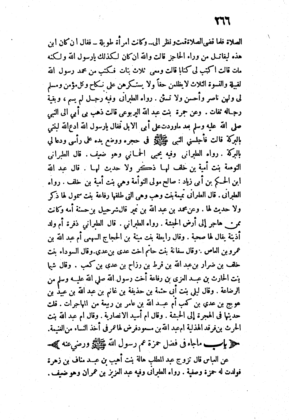 15444 - «وَعَنْ جَمْرَةَ بِنْتِ عَبْدِ اللَّهِ الْيَرْبُوعِيِّ قَالَتْ: ذَهَبَ بِي أَبِي إِلَى النَّبِيِّ - صَلَّى اللَّهُ عَلَيْهِ وَسَلَّمَ - بَعْدَمَا وَرَدَتْ عَلَى أَبِي الْإِبِلُ، فَقَالَ: يَا رَسُولَ اللَّهِ، ادْعُ اللَّهَ لِبِنْتِي هَذِهِ بِالْبَرَكَةِ. قَالَتْ: فَأَجْلَسَنِي النَّبِيُّ - صَلَّى اللَّهُ عَلَيْهِ وَسَلَّمَ - فِي حِجْرِهِ، وَوَضَعَ يَدَهُ عَلَى رَأْسِي، وَدَعَا لِي بِالْبَرَكَةِ».