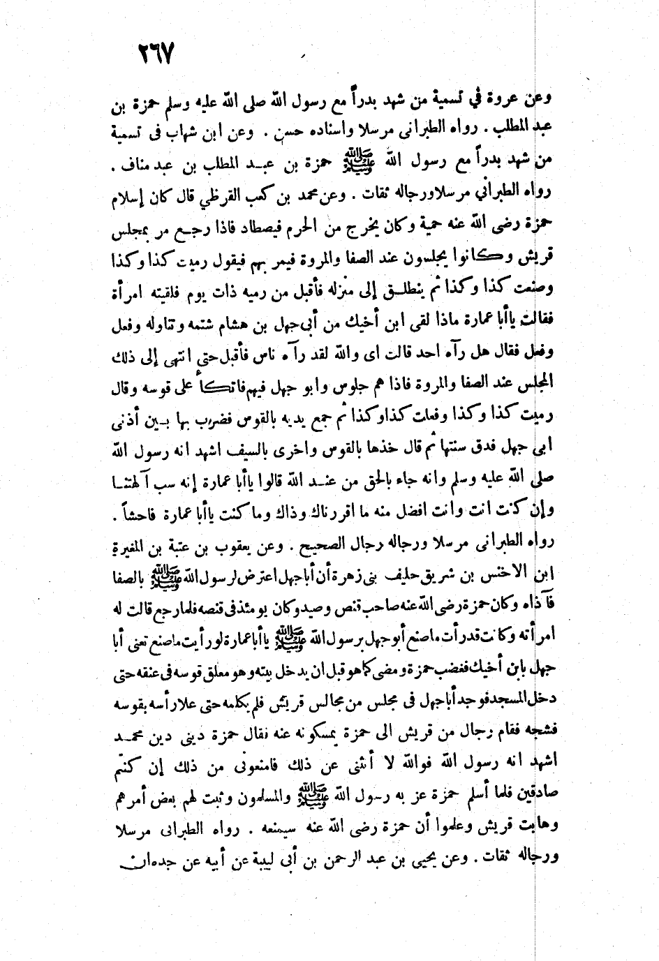 15460 - وَعَنْ مُحَمَّدِ بْنِ كَعْبٍ الْقُرَظِيِّ قَالَ: كَانَ إِسْلَامُ حَمْزَةَ - رَضِيَ اللَّهُ عَنْهُ - حَمِيَّةً [وَكَانَ رَجُلًا رَامِيًا]، وَكَانَ يَخْرُجُ مِنَ الْحَرَمِ فَيَصْطَادُ، فَإِذَا رَجَعَ مَرَّ بِمَجْلِسِ قُرَيْشٍ، وَكَانُوا يَجْلِسُونَ عِنْدَ الصَّفَا وَالْمَرْوَةِ، فَيَمُرُّ بِهِمْ فَيَقُولُ: رَمَيْتُ كَذَا وَكَذَا، وَصَنَعْتُ كَذَا وَكَذَا، ثُمَّ يَنْطَلِقُ إِلَى مَنْزِلِهِ. فَأَقْبَلَ مِنْ رَمْيِهِ ذَاتَ يَوْمٍ، فَلَقِيَتْهُ امْرَأَةٌ، فَقَالَتْ: يَا أَبَا عُمَارَةَ، مَاذَا لَقِيَ ابْنُ أَخِيكَ مِنْ أَبِي جَهْلِ بْنِ هِشَامٍ، شَتَمَهُ، وَتَنَاوَلَهُ، وَفَعَلَ [بِهِ] وَفَعَلَ، فَقَالَ: هَلْ رَآهُ أَحَدٌ؟ قَالَتْ: إِي وَاللَّهِ، لَقَدْ رَآهُ نَاسٌ، فَأَقْبَلَ حَتَّى انْتَهَى إِلَى ذَلِكَ الْمَجْلِسِ عِنْدَ الصَّفَا وَالْمَرْوَةِ، فَإِذَا هُمْ جُلُوسٌ وَأَبُو جَهْلٍ فِيهِمْ، فَاتَّكَأَ عَلَى قَوْسِهِ، وَقَالَ: رَمَيْتَ كَذَا وَكَذَا، وَفَعَلْتَ كَذَا وَكَذَا، ثُمَّ جَمَعَ يَدَيْهِ بِالْقَوْسِ، فَضَرَبَ بِهَا بَيْنَ أُذُنَيْ أَبِي جَهْلٍ فَدَقَّ سَنَتَهَا، ثُمَّ قَالَ: خُذْهَا بِالْقَوْسِ، وَأُخْرَى بِالسَّيْفِ، أَشْهَدُ أَنَّهُ رَسُولُ اللَّهِ - صَلَّى اللَّهُ عَلَيْهِ وَسَلَّمَ - وَأَنَّهُ جَاءَ بِالْحَقِّ مِنْ عِنْدِ اللَّهِ.