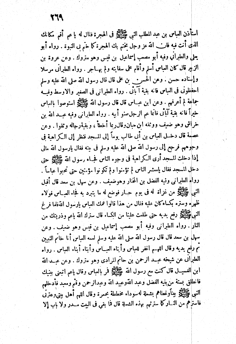 «اسْتَأْذَنَ الْعَبَّاسُ بْنُ عَبْدِ الْمُطَّلِبِ النَّبِيَّ - صَلَّى اللَّهُ عَلَيْهِ وَسَلَّمَ - فِي الْهِجْرَةِ، فَقَالَ لَهُ: " يَا عَمِّ، أَقِمْ مَكَانَكَ الَّذِي أَنْتَ فِيهِ ; فَإِنَّ اللَّهَ - عَزَّ وَجَلَّ - يَخْتِمُ بِكَ الْهِجْرَةَ كَمَا خَتَمَ بِيَ النُّبُوَّةَ».